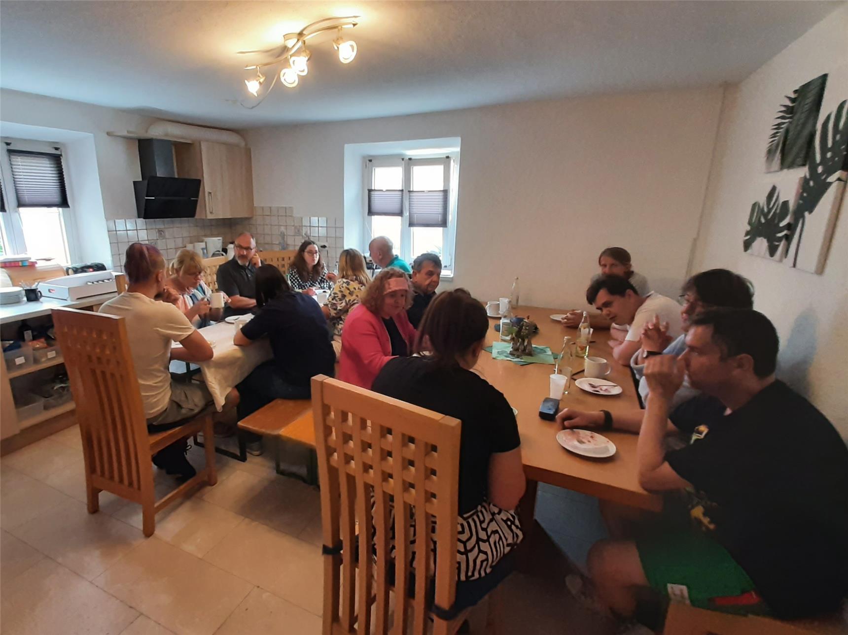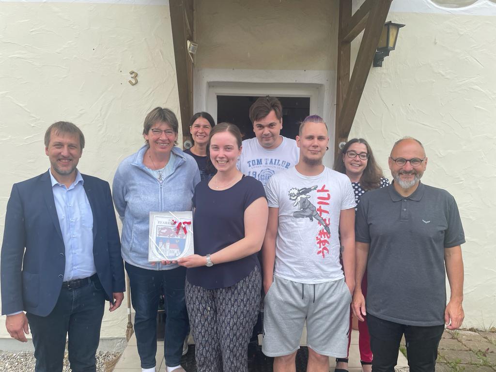 Einrichtungsleitung Anna Ganghofer konnte neben den Klient*innen, Kolleg*innen von WG und BEW auch Kathrin Seiler (geschäftsführende Vorständin Kreis-Caritasverband Rottal-Inn e. V.), Dr. Monika Müller-Rampmaier (stellvertr. Aufsichtsratsvorsitzende KCV), Wolfgang Beißmann (Bürgermeister Pfarrkirchen) sowie Elisabeth und Franz Schierer (Vermieter) begrüßen. Bürgermeister Wolfgang Beißmann hatte ein Geschenk dabei: ein gläsernes Wappen der Stadt Pfarrkirchen. Ganghofer‘s Dank galt allen Anwesenden und den Hausmeistern für die Unterstützung, vor allem bei den Umzügen. Diakon Mario Unterhuber segnete anschließend die Räume und die beiden Kreuze. Alle Gäste durften als "Gästebuch" ihre Wünsche auf kleine Zettel schreiben. Diese wurden dann an einer Girlande angebracht. Und eine Himbeerpflanze gab es auch noch zur Einweihungsfeier. Bei Kaffee und Kuchen, teilweise von den Klient*innen selbst gebacken, ließ man die Einweihungsfeier gemütlich ausklingen. Für die musikalische Unterhaltung sorgte der Triftener Chor. Dieser wurde von Kathrin Seiler an der Flöte unterstützt. Später sorgte ein Klient als DJ für passende Musik.