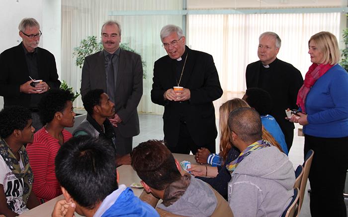 Unser Bild zeigt Weihbischof Diez (Mitte stehend), Caritasdirektor Juch (2. v. li.) und Pfarrer Vonderau (2. v. re.) im Gespräch mit den Flüchtlingen.