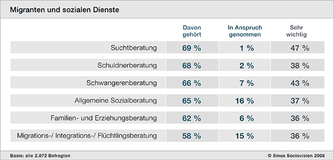 Dieses Ergebnis der Sinus-Studie weist darauf hin, dass sich die Menschen immer weniger als Migranten oder zu integrierende Personen verstehen. Sie brauchen Hilfe als von Sucht Betroffene, als Schwangere, als Menschen in der Schuldenfalle oder in Familienkrisen. Was zählt, ist die soziale Notlage, nicht die Herkunft. Dennoch gibt es vor allem ältere Menschen und Personen mit einfacher Schulbildung, für die die Unterstützung der Migrationsdienste und die muttersprachliche Beratung wichtig ist, um überhaupt Hilfe in Anspruch zu nehmen.