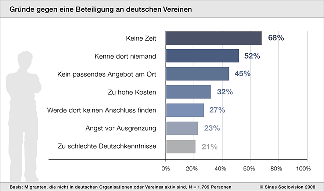 22 Prozent der Menschen mit Migrationshintergrund sind aktives oder passives Mitglied von Migrantenorganisationen. In den Vereinen der Einheimischen engagieren sich 18 Prozent, weitere zwölf Prozent würden gerne mitmachen. Dazu fehlt den meisten die Zeit (68 Prozent), der passende Verein oder sie scheuen sich, weil sie dort niemand kennen (52 Prozent). Allerdings gibt jeder Vierte als Grund, weshalb er sich nicht beteiligt, den schwierigeren Stand als Migrant an, sowie die Furcht vor Ausgrenzung oder ungenügende Deutschkenntnisse.