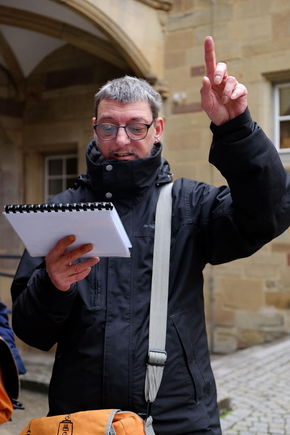 Der Teil der Führung von Helmut Blaha ist fertig und Erika Distler übernimmt. Beide haben einen oder mehrere Parts zum Vortragen, je nach kognitiven Möglichkeiten. Über altes, regennass glänzendes Kopfsteinpflaster führt Distler die Gruppe zum Schillerplatz und zur Markthalle, berichtet über Historie und Legenden. Wie Blaha nimmt sie ein Mäppchen zur Hilfe, in dem steht, was sie sagen möchte und muss. Wenn sie den Faden verliert, springt Andrea Dikel ihr zur Seite.