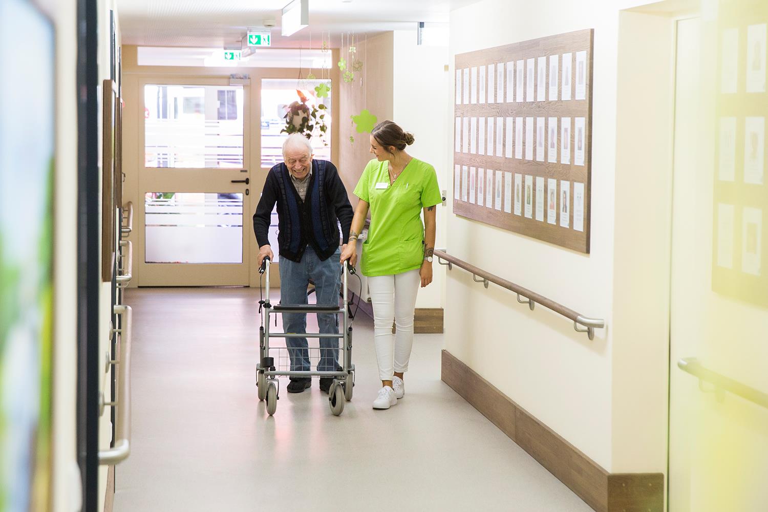 Mittlerweile ist sie routiniert im Umgang mit großen und kleinen Problemen. Franziska merkt es sofort, dass eine ältere Bewohnerin heute einen schlechten Tag hat. Sie nimmt sie liebevoll am Arm, hört ihr zu und führt sie zu einer Schale mit Süßigkeiten in ihrem Büro. Mit einem älteren Herren spricht sie vertraut schwäbisch. Er erzählt offen von seiner Familie. Generell bedient die Einrichtung nicht das übliche Bild von Altenpflege. Im Ernst-Ott Seniorenzentrum betreuen die Pfleger_innen nur jeweils vier Personen. Deshalb ist der Kontakt zu den Bewohnern sehr eng und sehr persönlich.