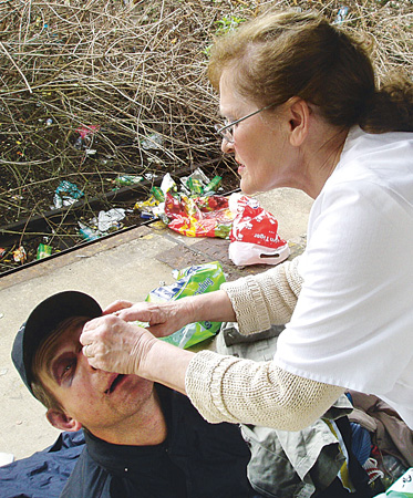 Resolut und ohne Berührungsängste: Schwester Nadja behandelt das verletzte Auge eines Wohnungslosen.Gabriela Crisand