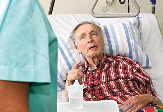 Später steht die Grüne Dame am Krankenbett von Siegfried Kratz. Der 81-jährige liegt seit einem Sturz auf der Geriatrie. Seit zwei Wochen hat er das Bett nicht verlassen. "Die Brötchen hier sind viel zu weich", verschafft er seinem Unmut Luft. Er erzählt der Grünen Dame von seiner Kontrastmitteluntersuchung am frühen Morgen und dem Sturz zu Hause in der Badewanne. Erst Stunden später sei ihm geholfen worden.