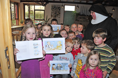 Es war nicht die Idee von Schwester Leodegaria, den Wohlfahrtsmarkenverkauf im Kindergarten einzuführen. Doch es ist ihr zu verdanken, dass dieses Engagement zu einem Erfolg in gleich mehrfacher Hinsicht geworden ist: finanziell, sozial und pädagogisch. Bereits ihre Vorgängerin Schwester Johanna Schmidt hatte Wohlfahrtsmarken an die Eltern der Kindergartenkinder verkauft. Schwester Leodegaria weitete dies in den letzten 30 Jahren aus, indem sie sich zusätzlich mit dem Anliegen an die Eltern der Kinder wandte, die den Kindergarten verlassen haben. Rund 30 Familien ruft sie in jedem November vor dem Erscheinen der Weihnachts- und kurz danach der Wohlfahrtsmarken an - und fragt, ob erneut Interesse besteht. Im Gespräch erfährt sie dann auch, was aus "ihren Zöglingen" geworden ist: was jemand studiert, wer geheiratet hat, welche Freuden und Sorgen sie haben. Wichtig ist der Schwester, mit den Familien in persönlichem Kontakt zu bleiben. "Sie einfach nur anzuschreiben und die Wohlfahrtsmarken anzupreisen, das wäre es mir nicht wert. Das Gespräch ist für mich das A und O", erklärt Schwester Leodegaria. Daher verschickt sie auch nicht die bestellten Wohlfahrtsmarken, sondern ihre Mitarbeiterinnen bringen sie in der Mittagspause oder nach der Arbeit bei den Familien vorbei: "um auch dort vielleicht noch das eine oder andere Wort zu wechseln und den Verkauf so auch zu einer Initiative des ganzen Kindergartens zu machen".