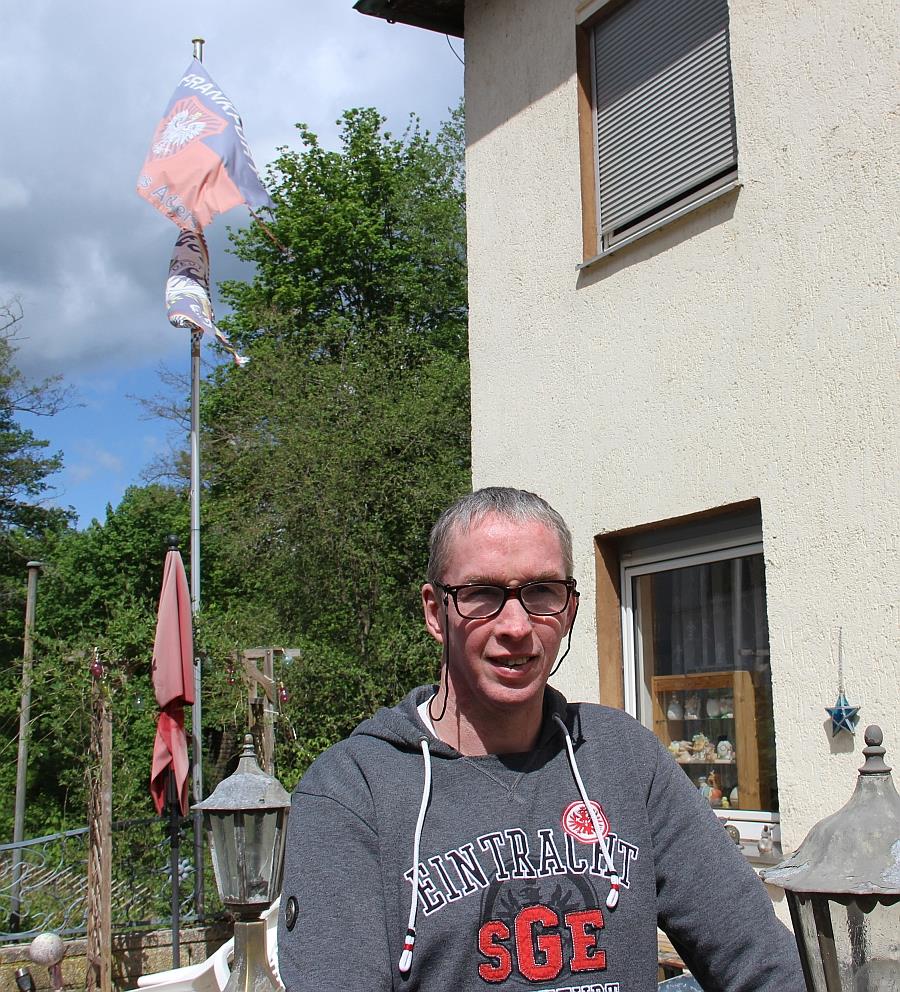 Selbstbewusst unter der gehissten Eintracht-Frankfurt-Fahne: Andreas Berry fühlt sich sehr wohl bei seiner Familie in Bad Salzschlirf.C. Scharf/Caritas FD