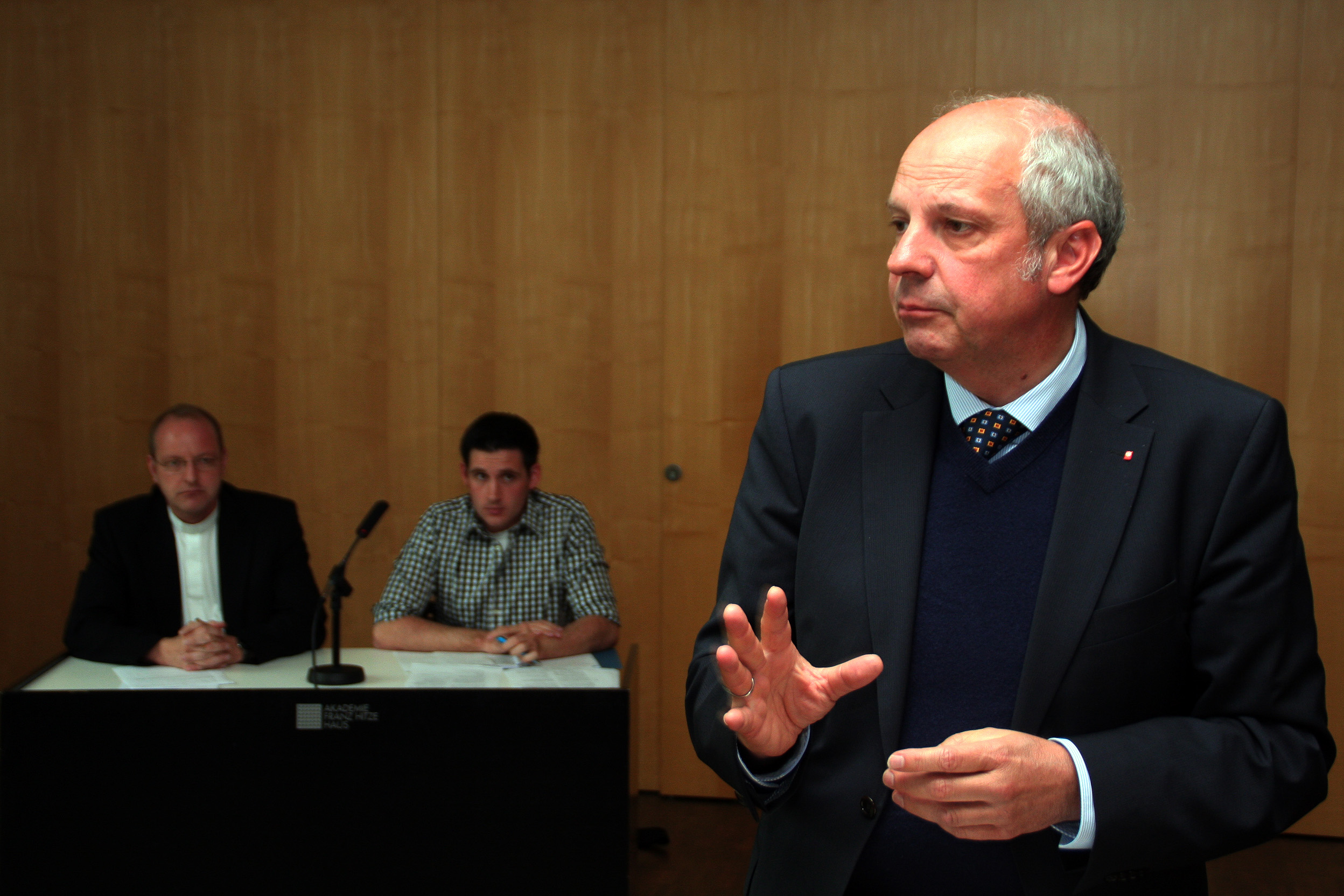 Diözesancaritasdirektor Heinz-Josef Kessmann stellt die Überlegungen zur Umsetzung der Präventionsordnung des Bistums in den Eirnrichtungen der Caritas vor. Dr. Jochen Reidegeld (links) und Martin Wazlawik erläuterten Ziel und Schulkonzept.