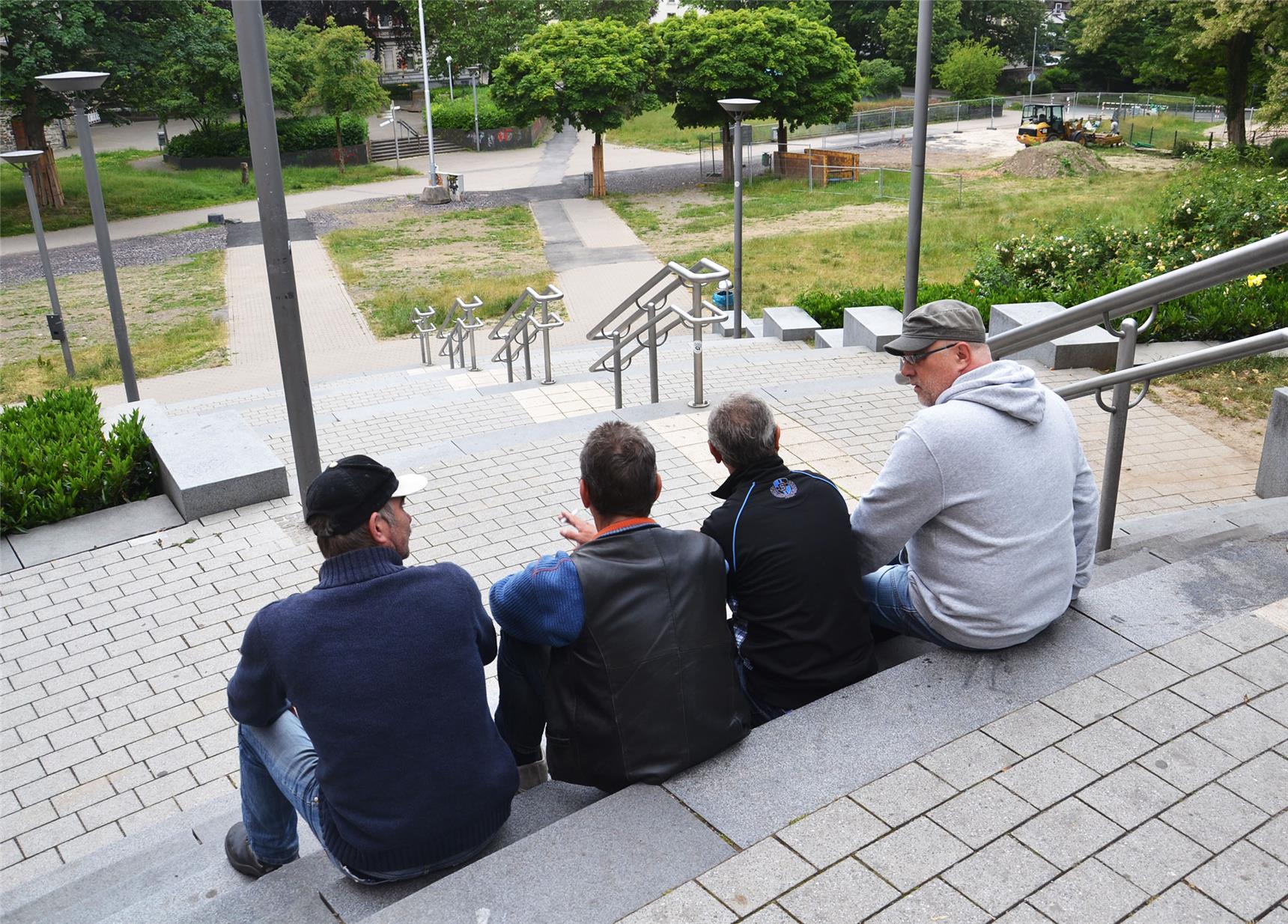 Uwe Browatzki (rechts) mit drei seiner Kunden, für die die Treppe in der südlichen Iserlohner Innenstadt so etwas wie eine zweite Heimat ist. (Foto: Lukas)