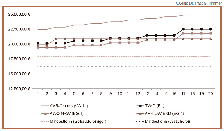 Im Folgenden wird die Bruttojahresvergütung für eine ungelernte Hilfskraft (zum Beispiel Reinigung) sowie für eine examinierte Pflegefachkraft gemäß den Arbeitsvertragsrichtlinien der Caritas (AVR-Caritas), den Arbeitsvertragsrichtlinien des Diakonischen Werks Deutschland (AVR DW EKD), dem Tarifvertrag des öffentlichen Dienstes Bund und Gemeinden (TVöD) und dem Tarifvertrag der Arbeiterwohlfahrt in Nordrheinwestfalen (AWO-NRW) jeweils in der aktuellsten verfügbaren Fassung verglichen. Bei den Hilfskräften ist darüber hinaus der Mindestlohn für Gebäudereiniger und Wäscherei mit abgebildet. Der Vergleich basiert auf 39 Wochenstunden und betrachtet den Vergütungsverlauf einer am 1. Dezember 2012 eingestellten Kraft über 20 Jahre.6 Vergütungsveränderungen, die nach diesem Stichtag wirksam werden, sind in den Vergleichsberechnungen nicht berücksichtigt.