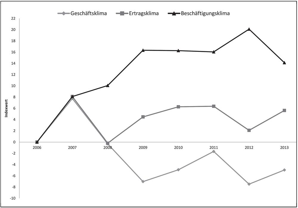 Das Ertragsklima entwickelt sich seit 2009 parallel zum Geschäftsklima. Auch hier ist eine leichte Erholung zu beobachten. Genauso wie beim Geschäftsklima ist dies auf die zukünftigen Erwartungen zurückzuführen. Vor allem der Anteil derer, die eine Verschlechterung erwarten, ist stark zurückgegangen. 2012 waren dies noch 28 Prozent, 2013 nur noch 20 Prozent. Von einer Verbesserung geht jedoch ein gleichbleibend geringer Anteil von 16 Prozent (2012: 15 Prozent) aus (s. Abb. 1).