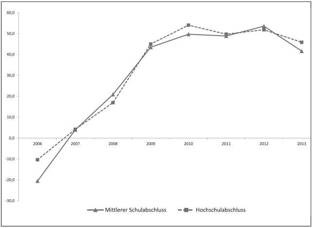 43 Prozent geben an, dass sich die Personalgewinnung für Mitarbeiter(innen) mit mittlerem Ausbildungsabschluss (zum Beispiel Krankenpfleger(innen), Altenpfleger(innen), Ergotherapeut(inn)en, Mitarbeiter(innen) in der Verwaltung im Gegensatz zum Vorjahr schwieriger dargestellt hat. Dieser Wert ist im Vergleich zu den Vorjahren zum ersten Mal deutlich zurückgegangen. 2012 lag der Anteil noch über zehn Prozentpunkte über diesem Wert. Auch für die Gewinnung von Personal mit Hochschulabschluss ist der Anteil derer, die eine Erschwernis zu den Vorjahren feststellen, gesunken. So waren dies 2013 48 Prozent (2012: 53 Prozent). Leichter wurde die Gewinnung von Personal für beide Personalgruppen jedoch nur minimal. Die Differenz zwischen denen, die eine erschwerte Personalgewinnung beobachten und denen, die von einer Erleichterung ausgehen, zeigt, dass sich seit 2007 die Personalgewinnung deutlich schwieriger gestaltet, mit der leichten "Entspannung" im Jahr 2013 (siehe Abb. 2).