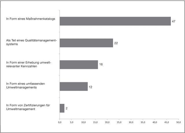 In den meisten dieser Einrichtungen und Dienste werden diese Maßnahmen in Form eines Maßnahmenkataloges (47 Prozent) in der Organisation verankert. Zertifizierungen für Umweltmanagement spielen mit zwei Prozent eine sehr untergeordnete Rolle. Gut ein Fünftel verknüpft das Umweltthema mit dem bestehenden Qualitätsmanagement und praktiziert damit einen systematischen Ansatz.