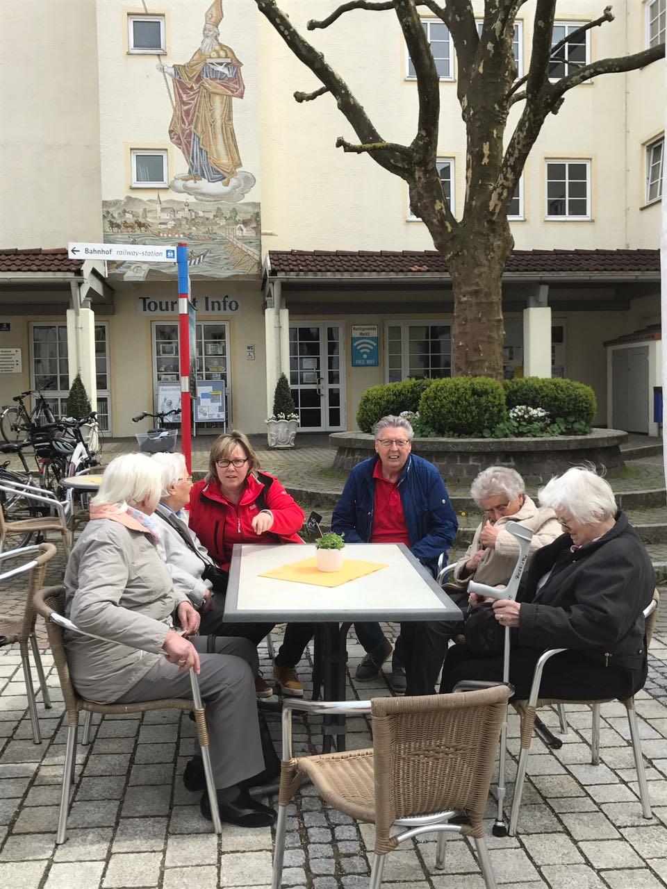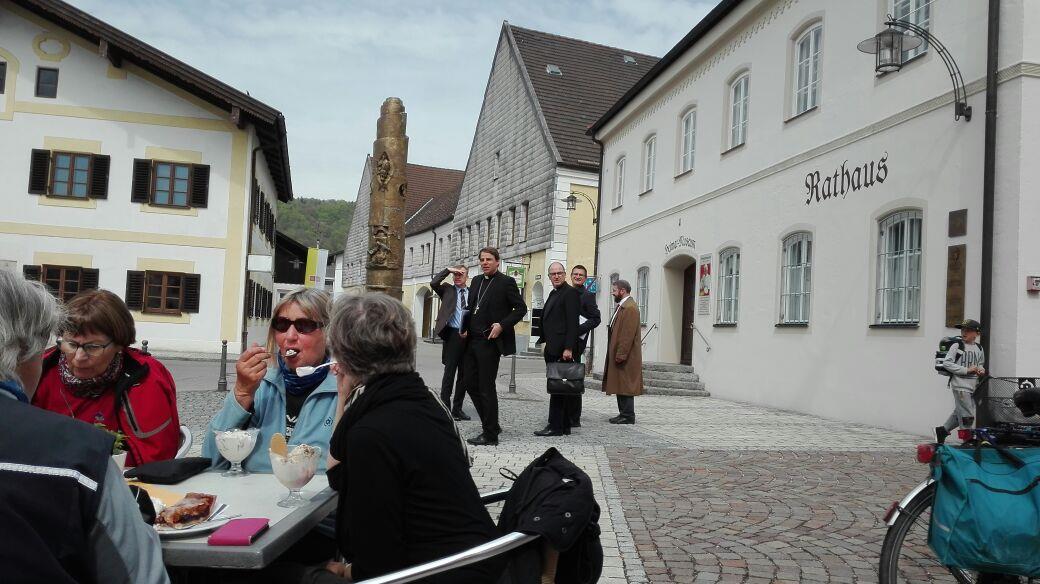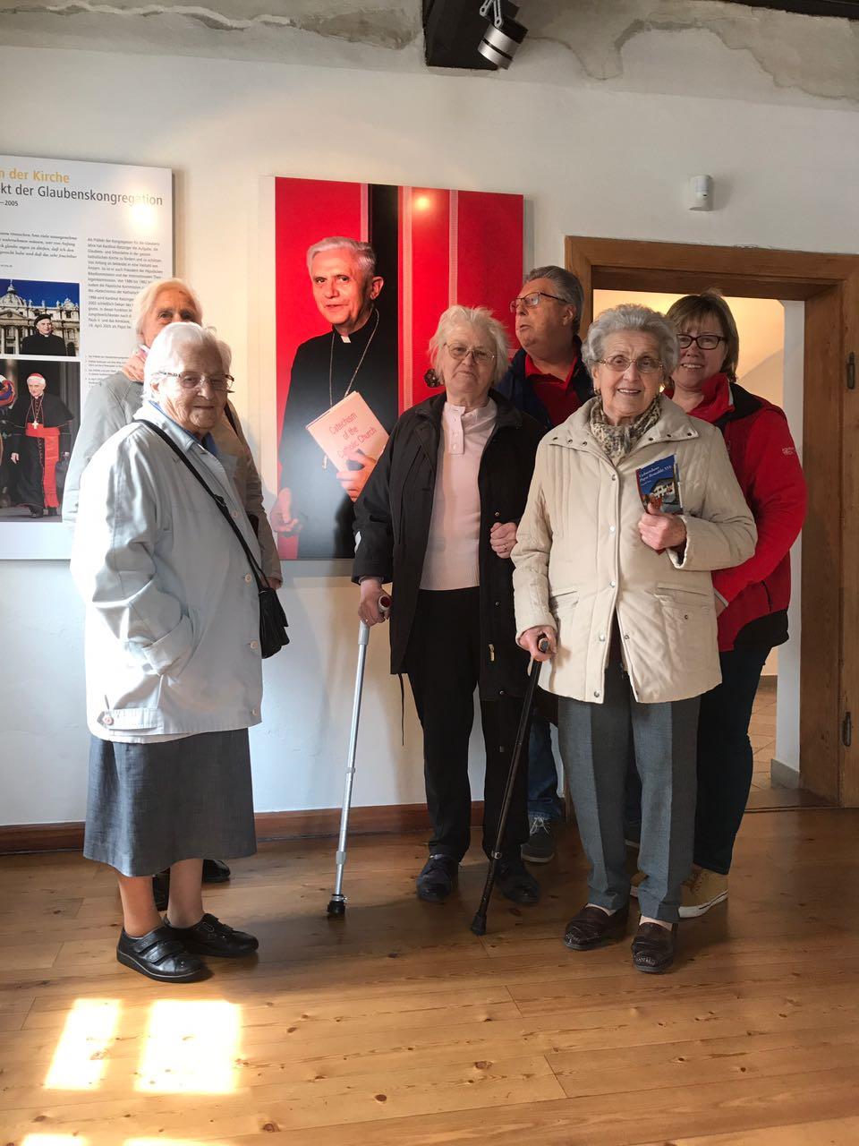 Einen ersten Ausflug haben die Senioren mit Betreuerin Irmi Göblmeier bereits unternommen. Auf allgemeinen Wunsch hin ging es nach Marktl zum Geburtshaus von em. Papst Benedikt XVI. Nach der sehr herzlichen Begrüßung durch eine Mitarbeiterin des Hauses konnte die Gruppe einen Film über die Kindheit von em. Papst Benedikt XVI. ansehen. Anschließend besichtigten alle die sehr interessante Ausstellung. In der Pfarrkirche von Marktl bestaunte die Gruppe danach noch den Taufstein. Bei herrlichem Wetter genossen alle noch Kaffee und Kuchen im Freien. Sehr zu ihrer Überraschung sahen sie noch Bischof Stefan Oster SDB, der mit einer Gruppe Geistlicher in Marktl zu Besuch war. Groß war die Freude, als Bischof Stefan zu den Ausflüglern an den Tisch kam und alle kurz begrüßte.