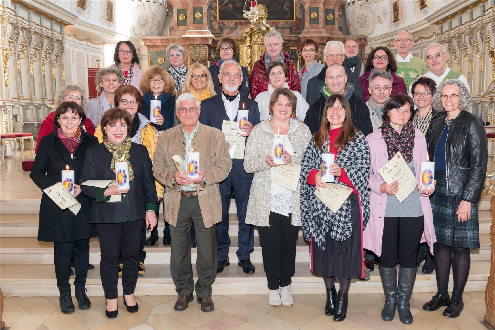 Am vergangenen Sonntag fand diese Vorbereitungszeit, die von allen Teilnehmern als sehr wertvoll empfunden wurde, im Sonntagsgottesdienst einen feierlichen Abschluss. Die neuen HospizbelgeiterInnen wurden von Pfarrer Wolfgang Schneck gesegnet und in das wichtige und verantwortungsvolle Ehrenamt entsandt. Caritasvorsitzender Stephan Wolk dankte den TeilnehmerInnen für die Zeit die sie in die Ausbildung und in die kommenden Begleitungen investieren und überreichte die Urkunden.