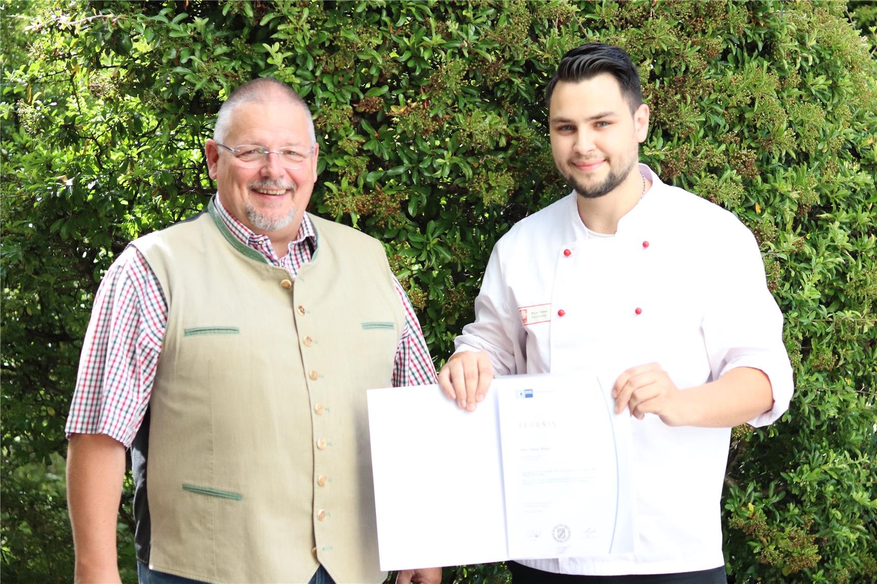 Tobias Mayer, Küchenleiter im Caritas Altenheim St. Konrad, hat mit Erfolg seine Ausbildereignungsprüfung bestanden. Der vier Lernfelder umfassende Vorbereitungskurs fand in Pfarrkirchen statt und dauerte sieben Tage. Die Prüfung, die aus einem schriftlichen sowie einem praktischen Teil bestand, fand bei der IHK in Passau statt. Mayer musste bei seiner Prüfung auch eine Unterweisung durchführen. Hier wählte er als Thema „Zubereitung eines Essig-Öl-Dressings“. Den Schlussteil der Prüfung bildete ein Fachgespräch, bei welchem fachliche sowie Fragen zu den Gesetzen zum Thema Ausbildung beantwortet werden mussten. Geschäftsführender Vorstand und Heimleiter Norbert Schellmann und stellvertretende Heimleiterin Iris Riglsperger gratulierten Tobias Mayer zur bestandenen Prüfung.