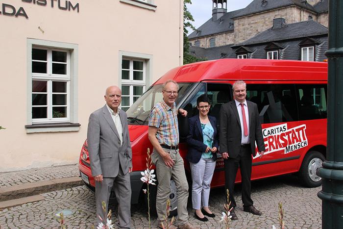 Gleich wird der Wagen gepackt: Fuldaer Ukraine Delegation mit Caritasdirektor Juch am Fahrzeug vor dem Caritas-Haus. M. Klüber/Caritas FD