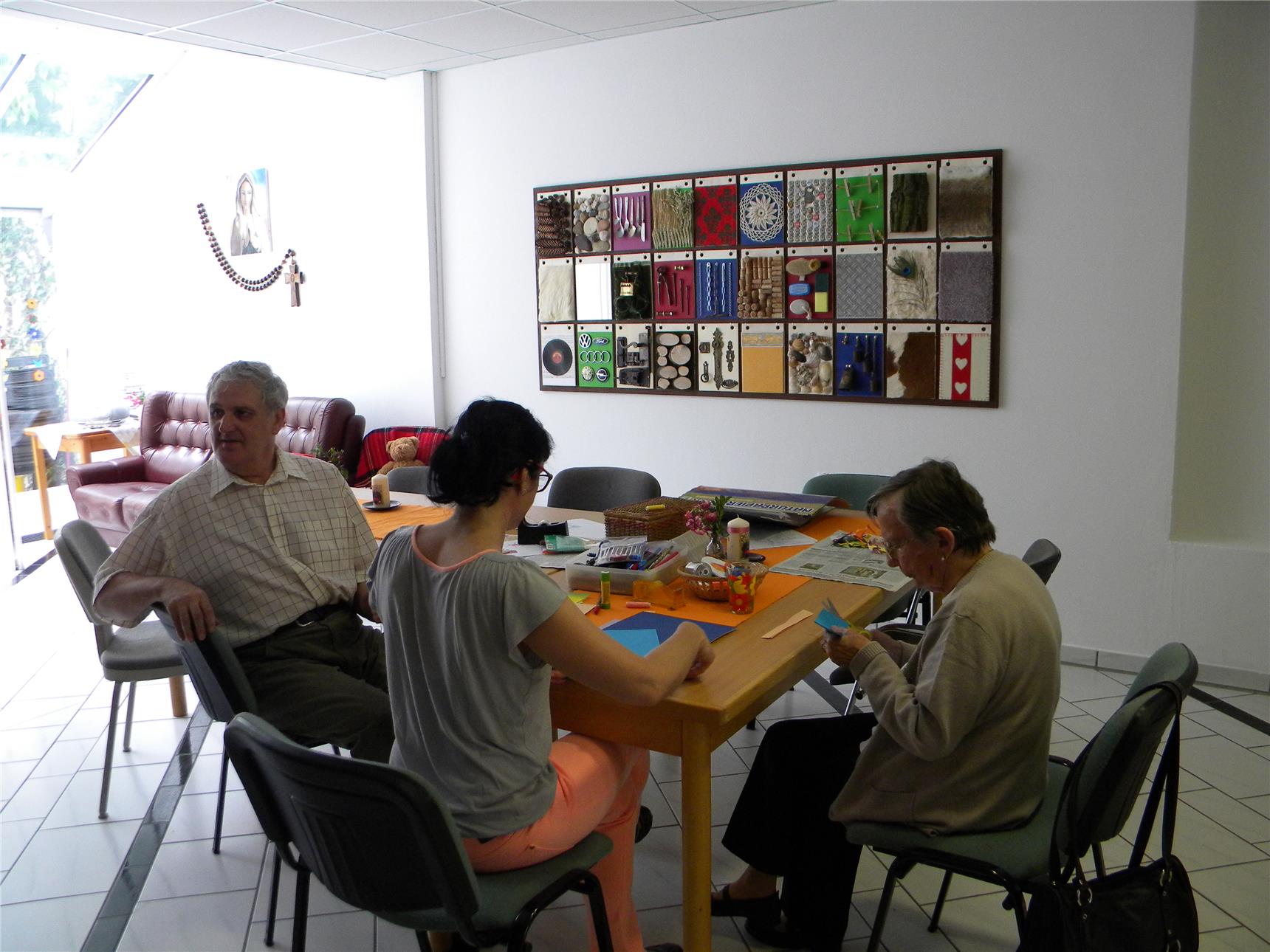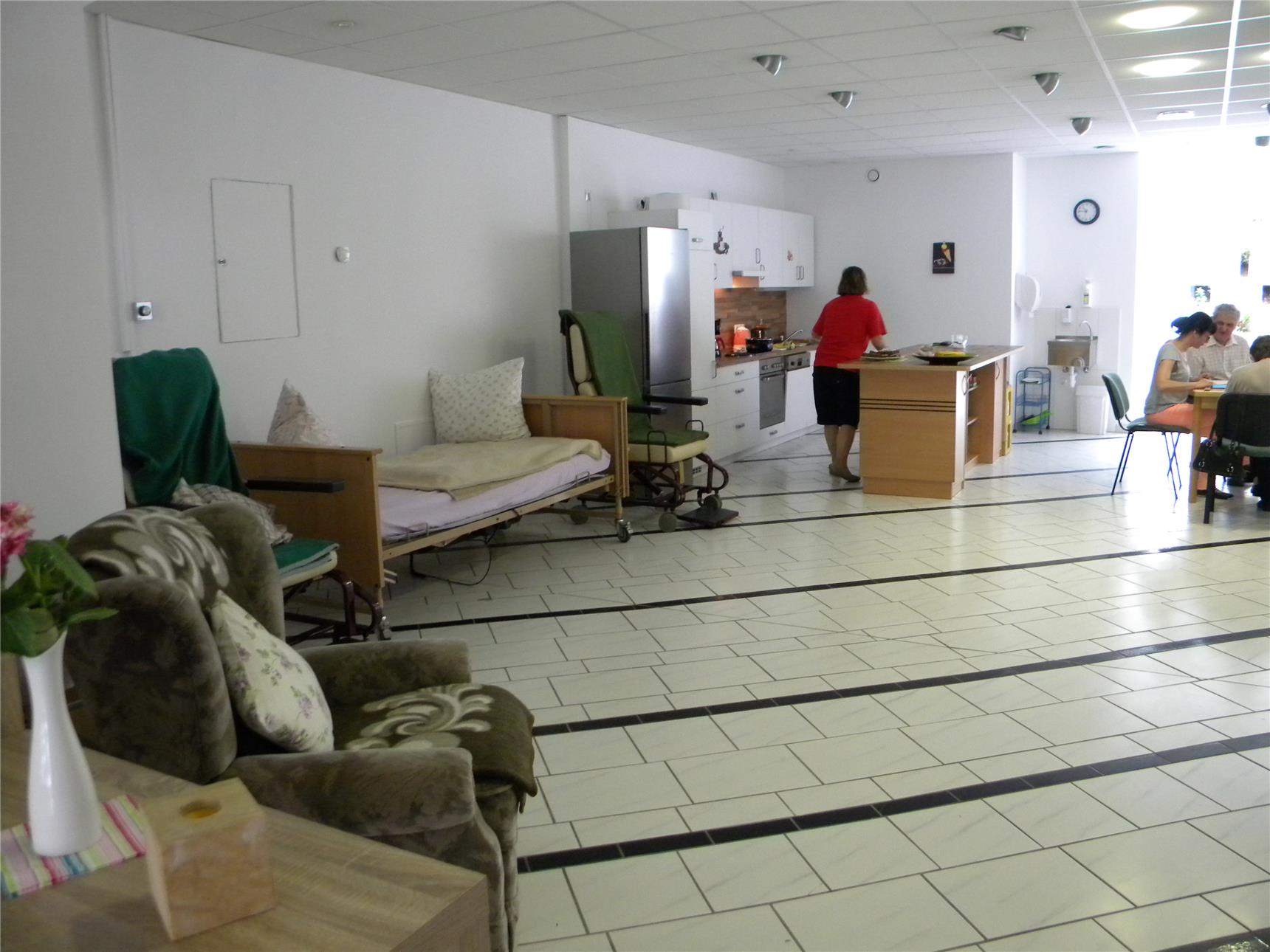 Ein Ladenlokal – groß, hell und geschmackvoll, abgestimmt auf die Bedürfnisse erwartet die Senioren. Aber auch für Besucher ist hier Platz. Im Foyer steht eine zum verweilen einladende Couch. Ein Schreibtisch für die geplanten Beratungen hat auch einen Platz gefunden. Ein großer Tisch und eine schöne und funktionelle Küche sind der zentrale Punkt des Raumes. Hier können die Betreuer/innen mit den Senioren kochen, basteln, backen, die Mahlzeiten einnehmen und vieles mehr. Auch für einen Ruhebereich wurde gesorgt. Schöne Bilder hängen an der Wand und das Besondere ist eine Fühlwand. Hier sind verschiedene Gegenstände und Dinge (Muscheln, Holz, Korken, Besteck u. v. m.) angebracht, die von den Senioren „erfühlt“ werden können. Silvia Dabrowski erschuf dieses Kunstwerk und dafür sind ihr alle dankbar.