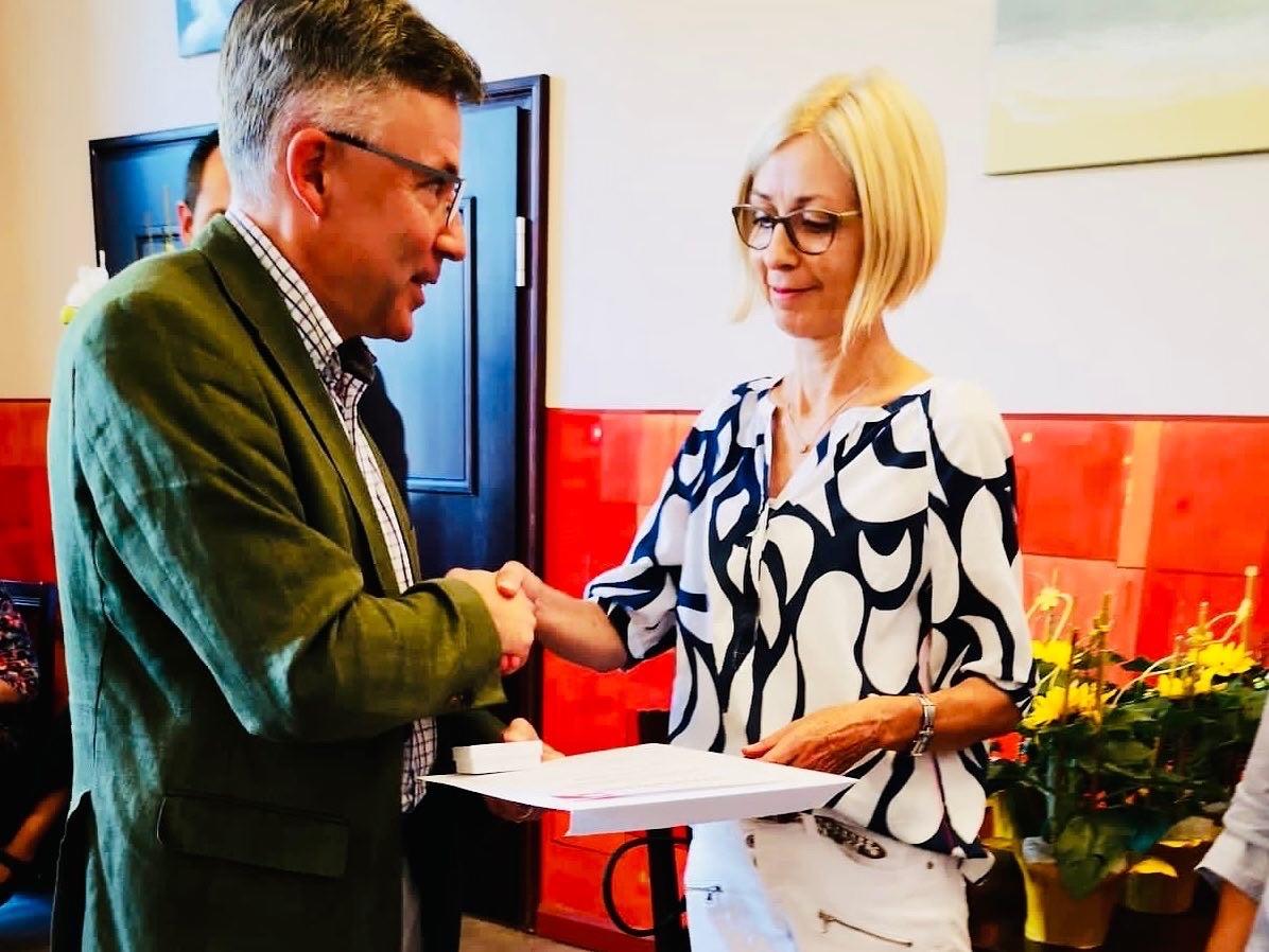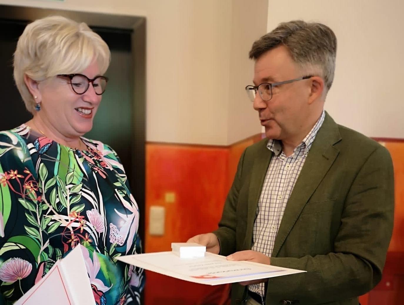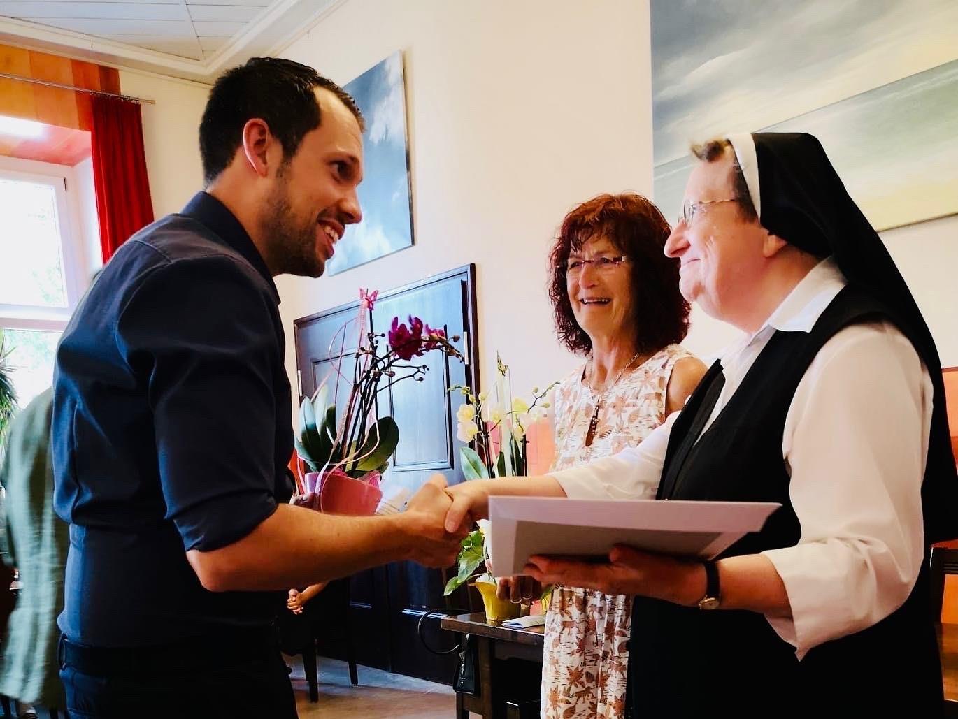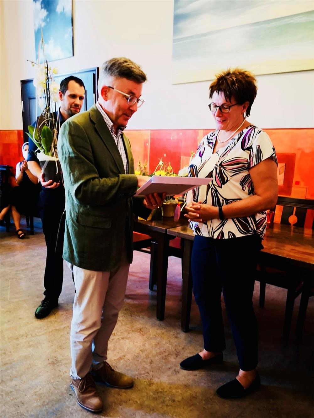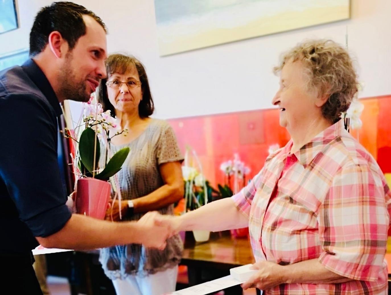 Beide hatten die schöne Aufgabe, langjährigen Ehrenamtlichen für ihr wichtiges Mitwirken im Hospizdienst zu danken und diesen Hospizbegleiter*innen eine Urkunde, die Caritasehrennadel und ein Blumengeschenk zu übergeben.