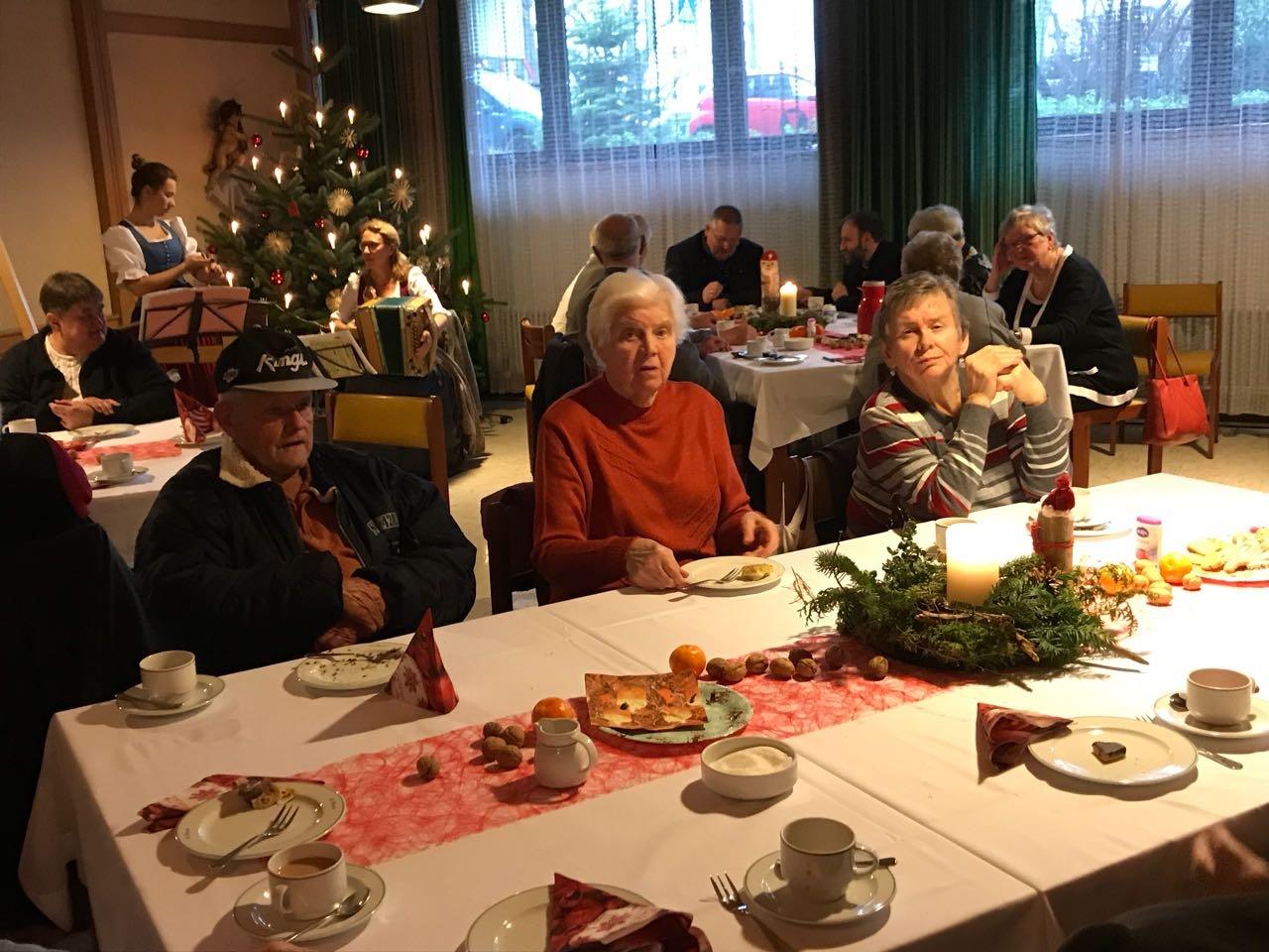 Pfarrvikar Rupert Wimmer hielt in der Kapelle des Altenheims St. Konrad eine Andacht. Danach ging es in den weihnachtlich geschmückten Saal des Altenheims. Die Einrichtungsleiterin der Caritas Sozialstation, Nicole Neumann, begrüßte die Senioren sowie Vorstand Norbert Schellmann und Pfarrvikar Rupert Wimmer aufs herzlichste Hier wurden die Senioren von den Schwestern der Sozialstation und den Betreuern der Tagesbetreuung aufs Beste um sorgt und mit Kaffee, Tee, Punsch, Plätzchen, Sollen und von den Schwestern und Betreuern selbst gebackenen Kuchen verwöhnt. Die Holzbach Musi mit Sabine Gruber und Team sorgten für die musikalische Umrahmung der Feier und hatten eine zur Adventszeit passende Geschichte dabei. Die Senioren freuten sich über die schöne Feier.
