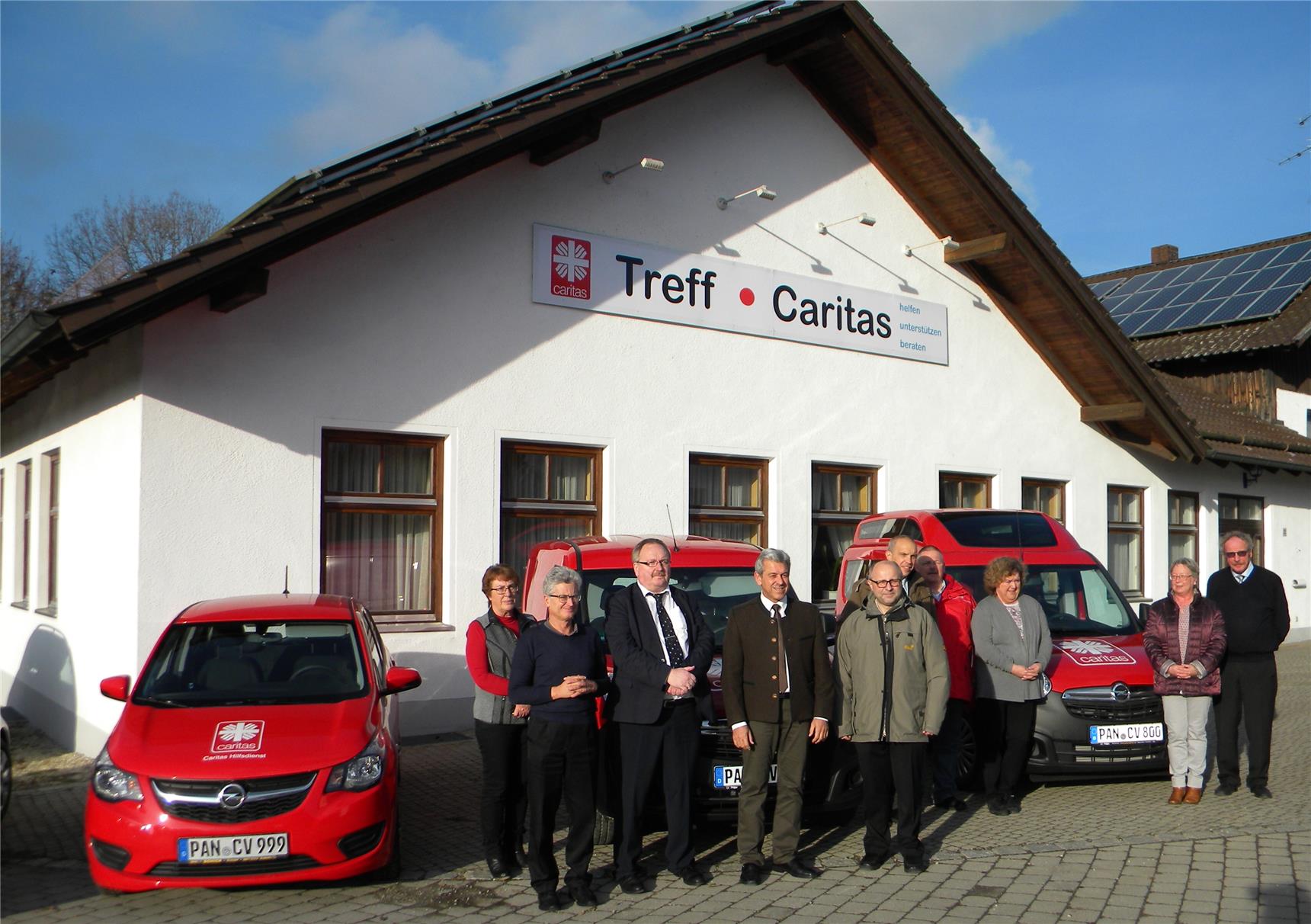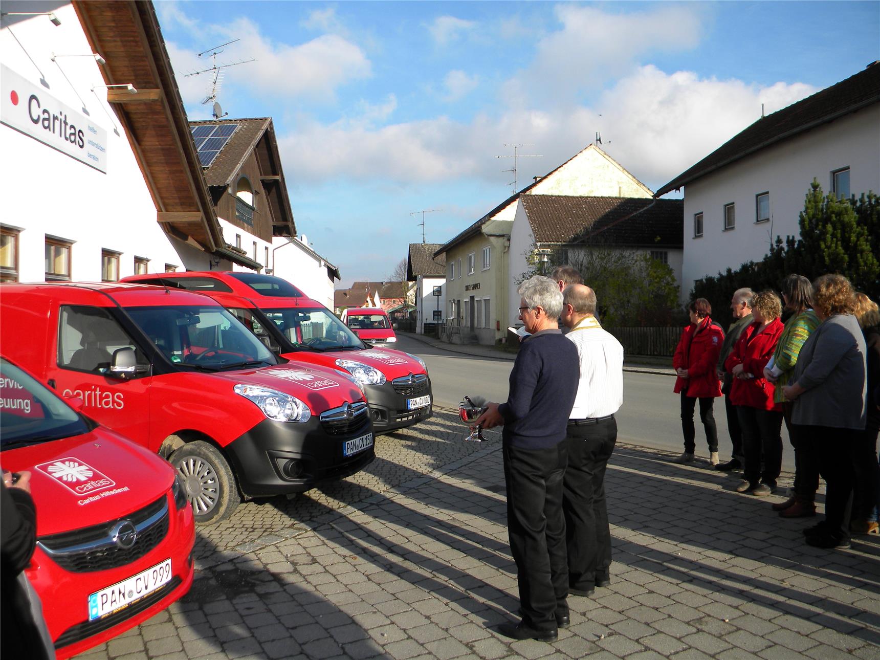 Pfarrer Heindl, Pfarrer Schön und Diakon Becher nehmen gemeinsam die Segnung der Räumlichkeiten vor. Es werden aber auch noch drei neue Fahrzeuge der Caritas gesegnet, u. a. Fahrzeuge für die Tagesbetreuung, den Essenservice und die Sozialstation. Sie wünschen viel Freude mit den neuen Räumlichkeiten und stets unfallfreies Fahren für alle. Für jedes Fahrzeug gibt es auch noch eine gesegnete Christopherusplakette. Zwei der Fahrzeuge wurden von der Glücksspirale finanziert.