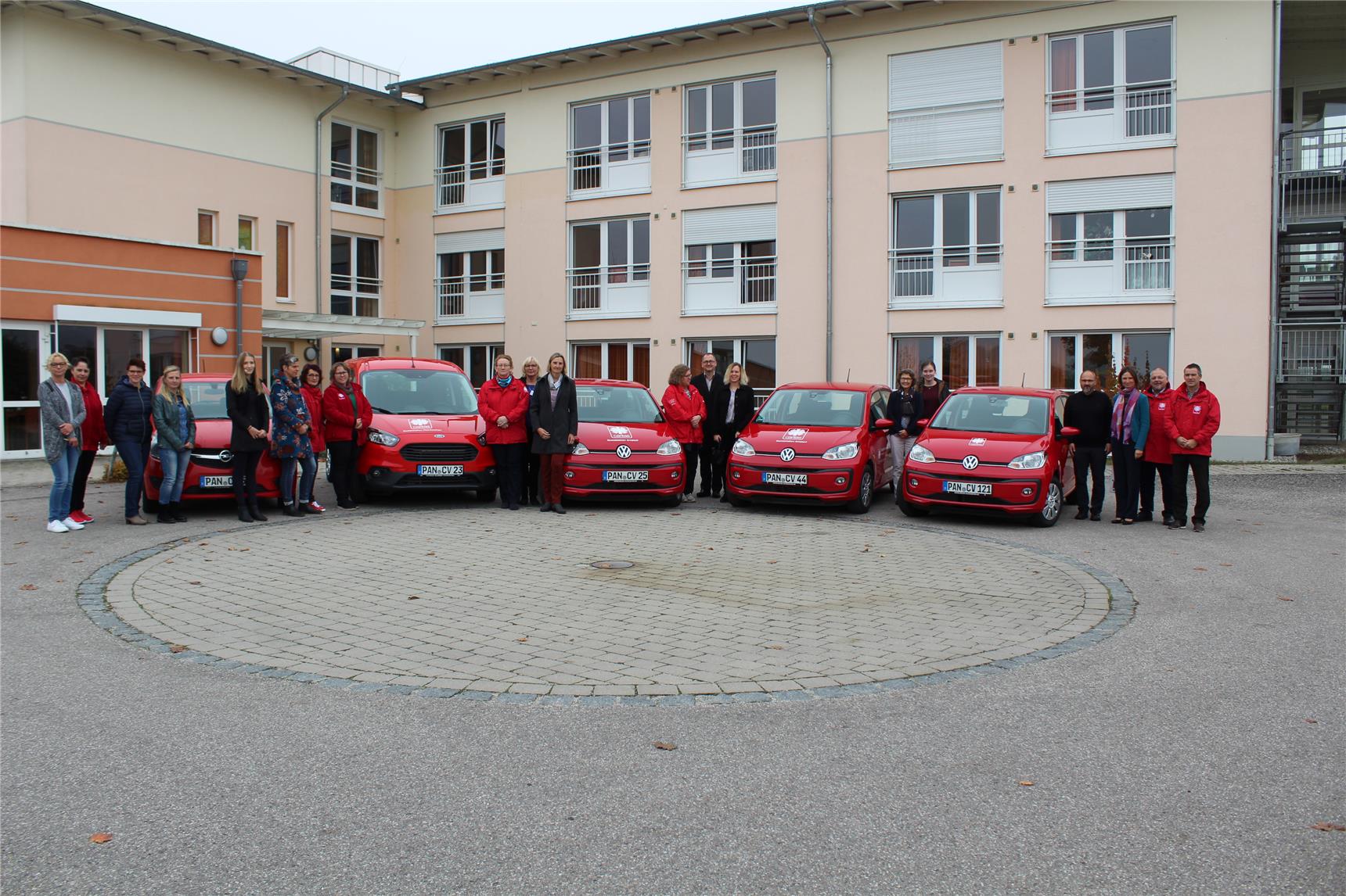 Vorstand Markus Tischler konnte Karin Neuss und Eduard Peschl vom Autocenter Neuss, Andrea Öllinger vom Autohaus Öllinger, seinen Vorstandskollegen Norbert Schellmann, Gerda Büchner, Heimleitung St. Vinzenz sowie Diakon Mario Unterhuber und viele Mitarbeiterinnen begrüßen. Mit einem Schmunzeln erklärte Tischler, dass dies seine dritte Fahrzeugsegnung sei und doch ist jede anders. Diakon Mario Unterhuber, der die Segnung der Fahrzeuge vornahm, freute sich: „Mit diesen Fahrzeugen wird der gesamte Kreis-Caritasverband (KCV) repräsentiert.“ Oft, so Diakon Unterhuber, wird man gefragt: Wie geht es dir? Man kann die Frage aber auch anders deuten, so Unterhuber. Wenn es einem gut geht, kann man überall hin – man ist mobil, wenn es einem schlecht geht, dann ist man nicht mehr mobil. Ihr, wandte sich Diakon Unterhuber, an die Mitarbeitenden des KCV, kommt mit euren Fahrzeugen zu denen, denen es nicht mehr gut geht, die nirgends mehr hinkommen. Ihr bringt den Leuten den Segen, weil ihr zu ihnen fahrt. Neben den Fahrzeugen segnete Diakon Unterhuber auch die Christophorus-Schlüsselanhänger für die neuen Fahrzeuge.
