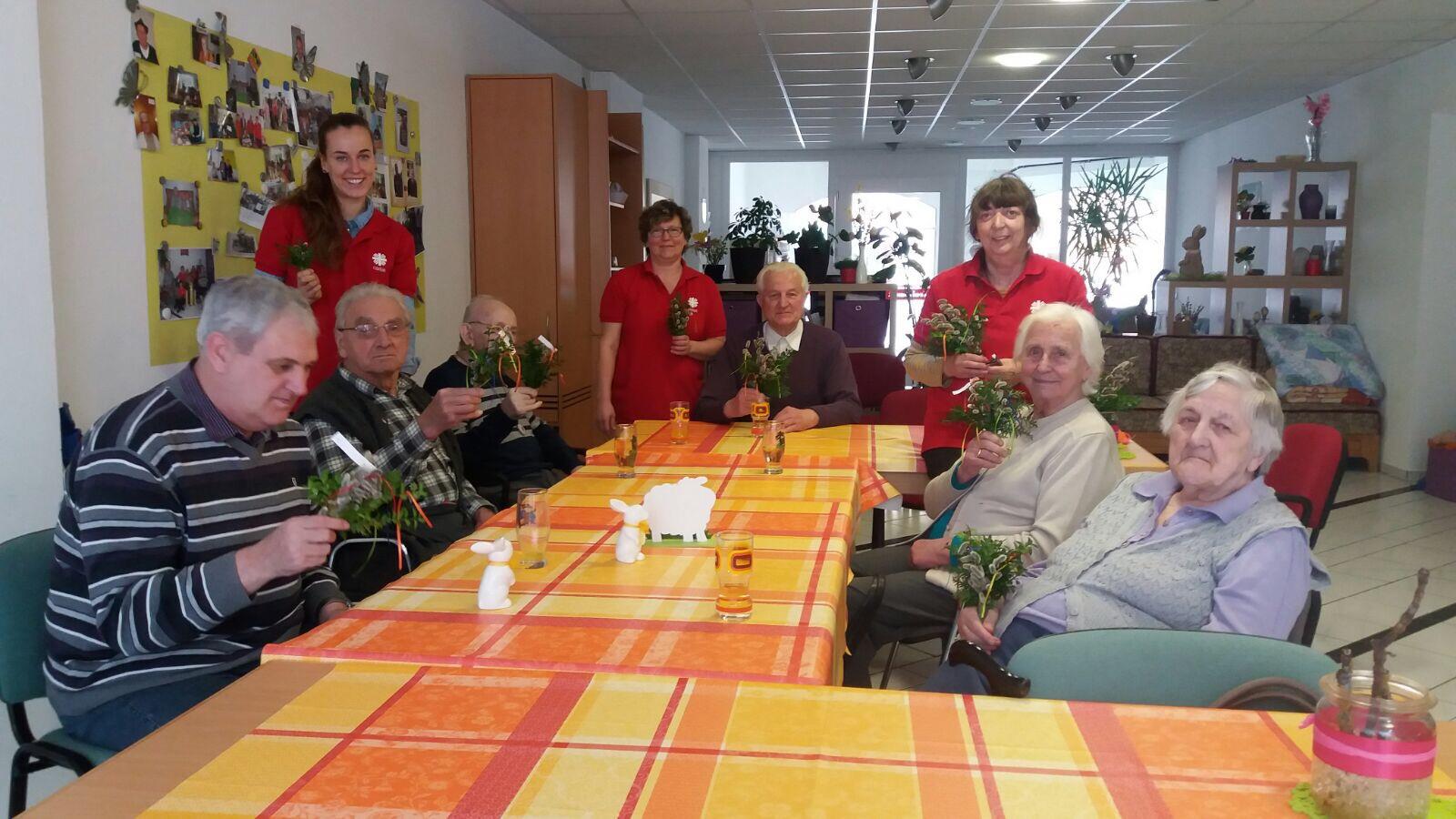 Wenn die Palmbuschen geweiht sind, kann jeder der Senioren seinen eigenen Palmbuschen mit nach Hause nehmen. Stolz auf ihr Ergebnis sind: Alois Reitmaier, Rudolf Obermeier, dahinter Betreuerin Susanne Schmidbauer, Sepp Eichinger, Betreuerin Gudrun Lukas, Karl Lindinger, Betreuerin Christine Bauer, Maria Aigner, Kreszenz Fischer.