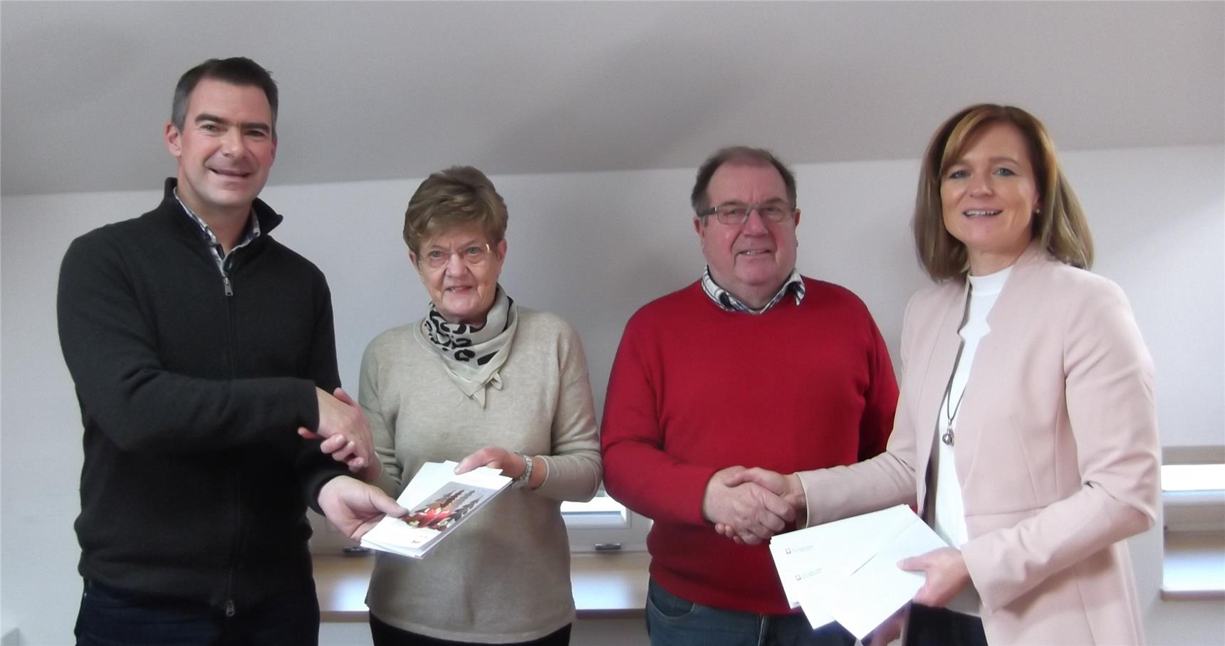 Bei einem Besuch in der Geschäftsstelle des Kreis-Caritasverband Rottal-Inn e. V. übergaben Brigitta Magg und Gottfried Konrad vom Pfarrcaritasverein Pfarrkirchen an geschäftsführenden Vorstand Eva Reiter sowie Vorstand Markus Tischler (KCV) deshalb Kuverts mit einem kleinen Zuschuss für das bevorstehende Weihnachtsfest. Eva Reiter versprach eine schnelle Weiterleitung des Geldes durch die Caritas-Mitarbeiter.