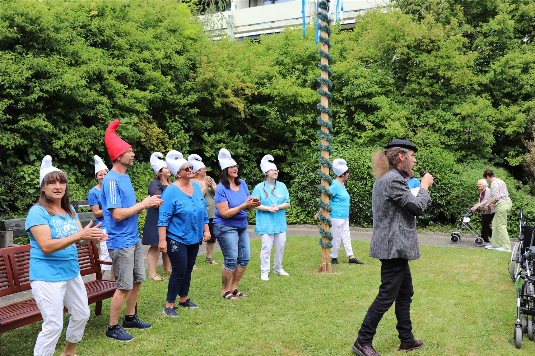 Bei strahlendem Sonnenschein begrüßte Christiane Kirschner (stellv. Betreuungsleitung) die Bewohner*innen und versprach ein Sommerfest mit vielen Überraschungen. Hatte man doch bekannte "Schlagerstars" eingeladen. Heino (Barbara Müller) gab "Die schwarze Barbara" zum Besten, die Wildecker Herzbuben (Martha Brandstetter, Barbara Schellmann) überraschten mit "Die Fischerin vom Bodensee", Roy Black (Ilse Winetzhammer) und die kleine Anita (Verena Prosteder) erklärten allen, wie "Schön es ist auf der Welt zu sein" und Nana Mouskouri (Christiane Kirschner) sang mit viel Leidenschaft "Die weißen Rosen aus Athen". Absolutes Highlight war der Auftritt von Vater Abraham mit seinen Schlümpfen, die natürlich das weltbekannte "Schlumpflied" vortrugen. Die Senioren von St. Konrad hatten sehr viel Freude an den Darbietungen, spendeten viel Applaus und sagen fleißig mit.