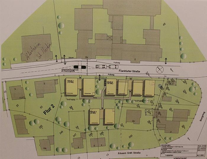 Das Bauvolumen und den Kostenrahmen sowie die Finanzierung im Einzelnen stellte Caritas-Vorstandsmitglied Ansgar Erb vor. So setzen sich die rund 4,8 Millionen Euro Baukosten aus Eigenmitteln (1,45 Millionen Euro) und Bankdarlehen (2,68 Millionen Euro) zusammen, ferner komme für zehn der 30 Wohnungen öffentliche Förderung ("Sozialer Wohnungsbau") durch das Land Hessen (628.000 Euro) und die Bad Orb Kur GmbH (100.000 Euro) hinzu. Die Baumaßnahmen, so Erb, sollen am 2. Mai starten, im Januar 2017 solle der Rohbau stehen und im Oktober kommenden Jahres die Fertigstellung erfolgen.