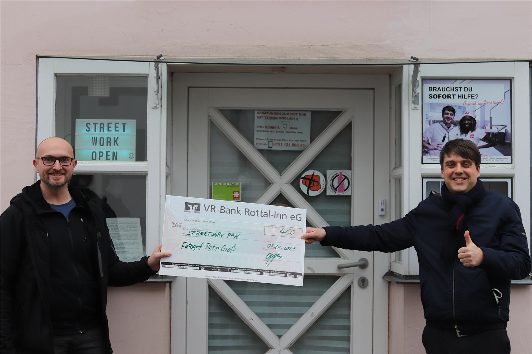 Streetworker Jakob Kandlbinder, der sich sehr über die Spende freute, hat für den Spendenbetrag 20 Stück Essensgutscheine zu je 20 Euro bei einem Discounter erworben und an bedürftige junge Menschen verteilt. Leider ist es in der Krisensituation oft, so Kandlbinder, dass die jungen Menschen nichts mehr im Kühlschrank haben. Die Spendenübergabe fand unter Einhaltung aller Corona-Regeln statt.