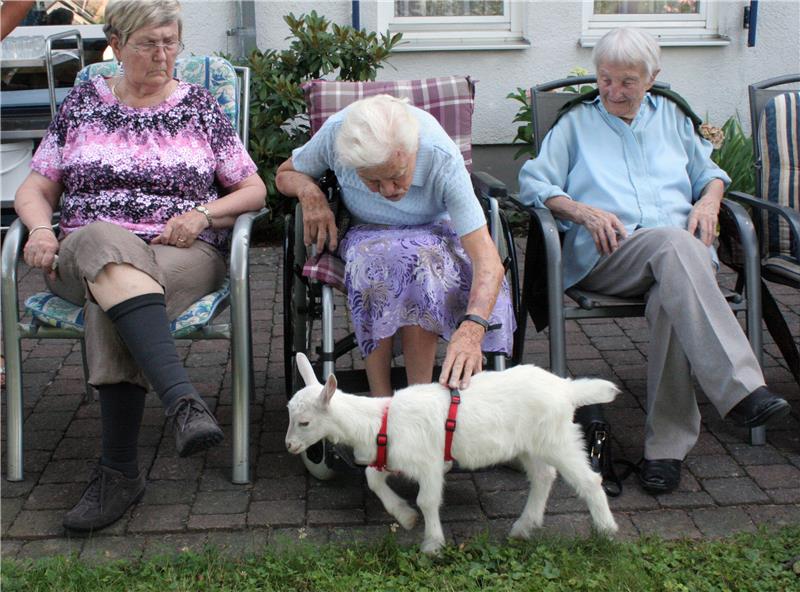 Die Idee mit dem Streichelzoo hatte Ursel Lichius während einem der Besuche bei ihrem Onkel, der im Haus St. Josef lebt. Einrichtungsleiterin Rita Schlageter war von dem Vorschlag sofort begeistert und gab ihr Okay. Schließlich ist die positive Wirkung von Tieren in vielen Bereichen der Pflege sowie deren Einsatz bei verschiedenen Therapien weitläufig bekannt. Vor allem auch in der Seniorenarbeit. Die Tiere wie auch die Bewohner des Altenzentrums genossen die Streicheleinheiten sichtlich. Gleichzeitig waren die Senioren aber auch wissbegierig und wollten von Ursel Lichius so manches wissen. So musste sie unter anderem Fragen beantworten wie etwa "Wie alt wird eine Ziege?" oder "Wie viele Jungen bekommt so ein Kaninchen?".
