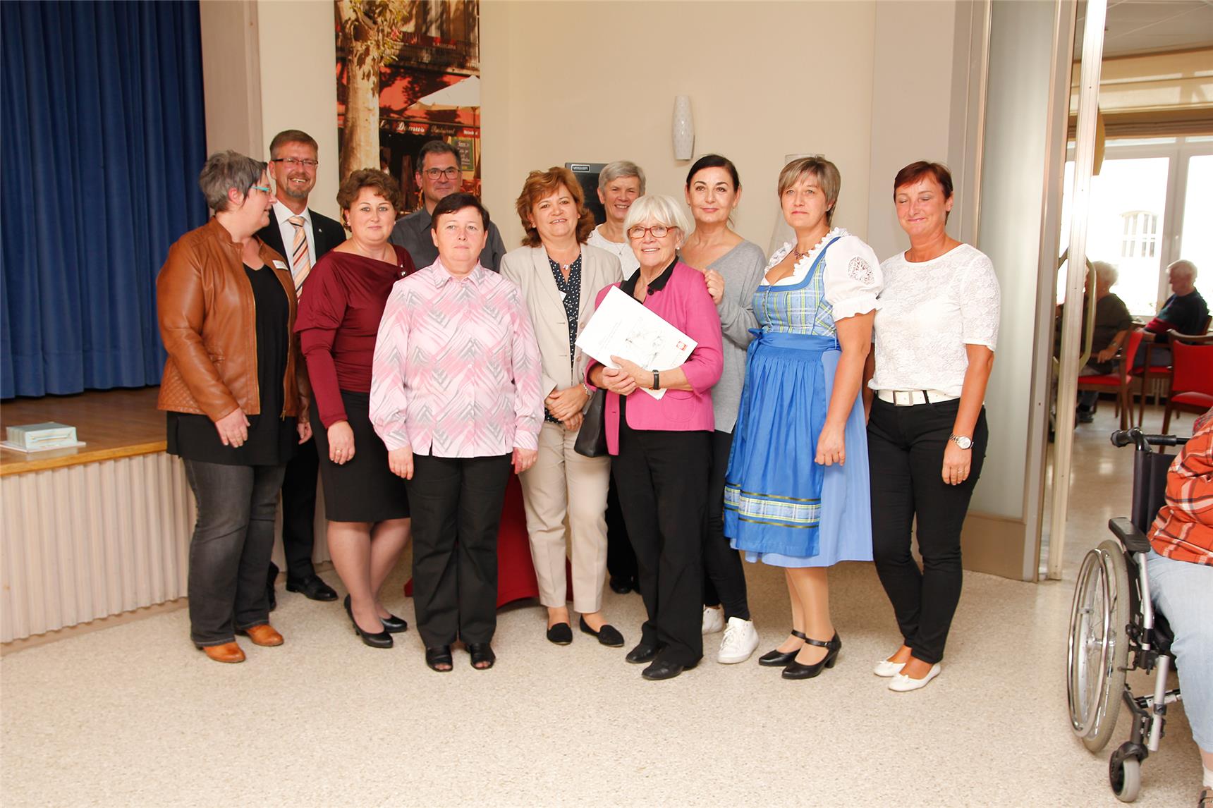 Brigitta Hofmann, Geschäftsführerin der CAB Caritas Augsburg Betriebsträger gGmbH, zu der das Caritas-Seniorenzentrum St. Raphael gehört, nutzte gemeinsam mit Einrichtungsleiter Andreas Bader die Feier nach dem Gottesdienst, acht langjährigen Mitarbeiterinnen Dank auszusprechen und als Zeichen der Anerkennung nicht nur eine Urkunde mit Ehrennadel der Caritas, sondern auch ein Geschenk zu überreichen. "Ihre Treue für Ihren Beruf, Ihren Dienst für die Ihnen anvertrauten Menschen, ist sehr bewundernswert", sagte Hofmann.