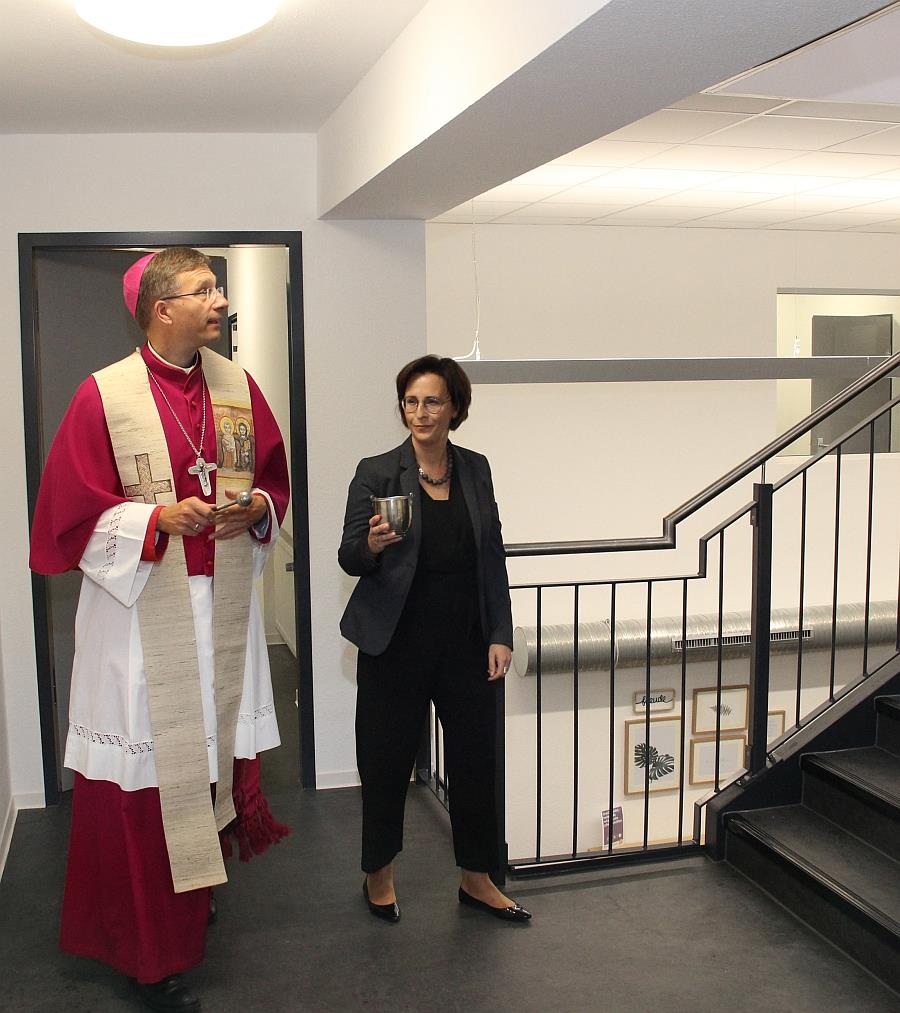 Segnungsrundgang mit Weihwasser: Der Fuldaer Bischof Dr. Michael Gerber und Schulleiterin Dajana Herbst auf dem Weg in die neue oberste Etage der Pflegeschule.C. Scharf/Caritas FD