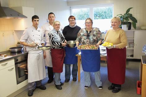 Bereits seit fünf Jahren besteht das Bistro als ein internes Angebot neben vielen anderen der Kontakt- und Beratungsstellen für psychisch kranke Menschen. Die Idee sei damals entstanden. Es galt, ein gemeinsames Angebot für die Menschen der benachbarten neu eingerichteten Tagesstruktur der Gangelter Einrichtungen, des Betreuten Wohnens und der Kontakt- und Beratungsstelle vorzuhalten. Ziel ist: Sie untereinander in Kontakt zu bringen und am Abend ihre Freizeit sinnvoll gestalten, erklärt Traudel Reissmüller. Um den Ablauf kümmere sich mittlerweile ein festes Team freiwilliger Mitarbeiter. Das sind Besucher des Treffpunktes und Klienten des Betreuten Wohnens, die im Vorfeld den Einkauf übernehmen und nach einem Monatsplan für die zirka 35 Besucher kochen, im Bistro servieren und kassieren. "Wir wollen orientiert an der Normalität, jedoch im geschützten Rahmen unter unserer Begleitung unsere Besucher dabei unterstützen, ihre Fähigkeiten und Stärken in den Blick zu nehmen und zu entwickeln, ihre Belastbarkeit zu erproben und ein stabiles Selbstwertgefühl aufzubauen", formuliert Traudel Reissmüller das Ziel. Es habe sich gezeigt, dass das Team hoch engagiert seiner Arbeit nachgehe. Auch Koch Markus Reichardt ist voll des Lobes. "Alle sind wissbegierig und sehr motiviert." Und so lädt er kurzerhand das Team dazu ein, seine Großküche im Krankenhaus zu besichtigen.