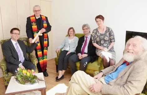 Ihnen gefällt die neue Tagespflege des Caritasverbandes in Venn (v.l.): Geschäftsführer Frank Polixa, Pfarrer Heinz-Josef Biste, der das Kreuz der Einrichtung weihte, Tagespflege-Leiterin Brigitte Stumpf, Erster Vorsitzender Dr. Christof Wellens, Bereichsleiterin Manuela Jansen und Bezirksvorsteher Reinhold Schiffers während der Eröffnungsfeier.Georg Maria Balsen