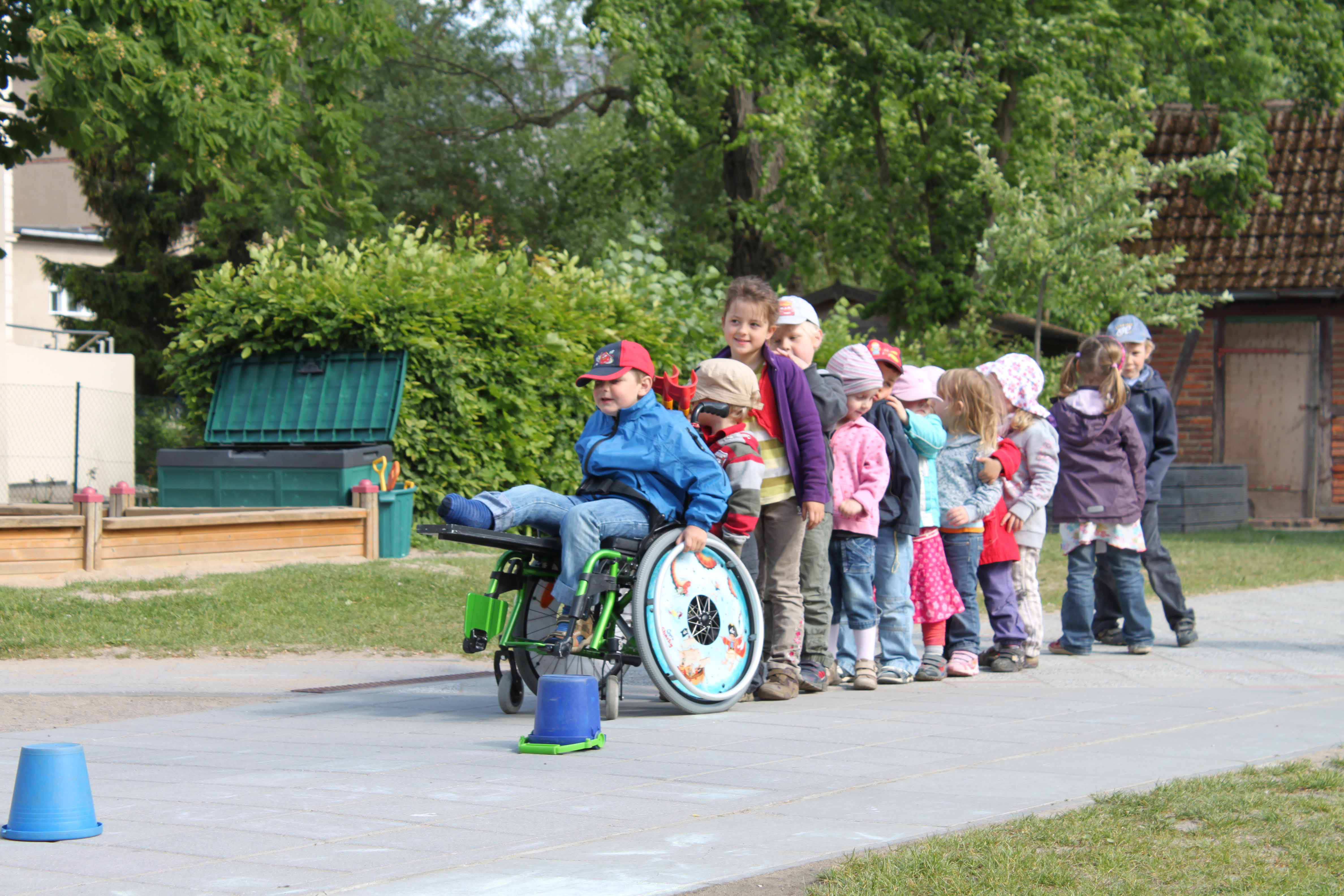 "Ich bin die Lokomotive", ruft der fünfjährige Jendrik grinsend seinen Freunden zu. Heute hat seine Gruppe in der katholischen Kita Marienkrone in Stralsund ihren Sportvormittag. Diesmal auf dem Hof, der versteckt hinter dem Seniorenzentrum liegt. Schnell hat seine Erzieherin Gabrielle Tobias alle Kinder hinter Jendrik aufgestellt und er darf losrollen. Kräftig schiebt er seinen Rollstuhl um die Plastikeimer, die als Hindernisse dienen.