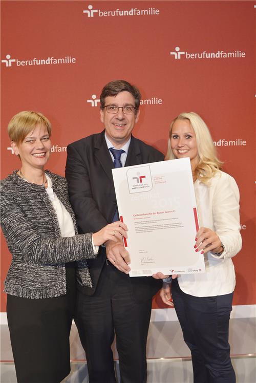 Ein Trio der Freude in Berlin zur Verleihung des Zertifikats „beruf und familie“: Diözesan-Caritasdirektor Andreas Meiwes, Projektleiterin Irmgard Handt (li.)Caritas