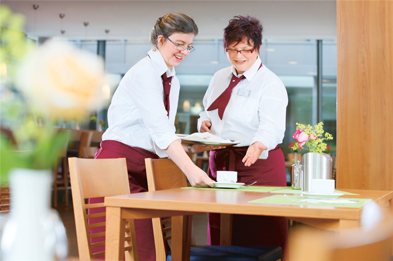 Jessica Schätzlein ist trotz ihrer Handicaps auf dem Weg zu einer erstklassigen Servicefrau. Das sieht auch der nicht behinderte Arbeitskollege Marcos Smid so, der sagt: „Es ist toll zu sehen, mit welcher Begeisterung die behinderten Kollegen lernen.“Franz Sales Haus, Valeska Ehlert, ar