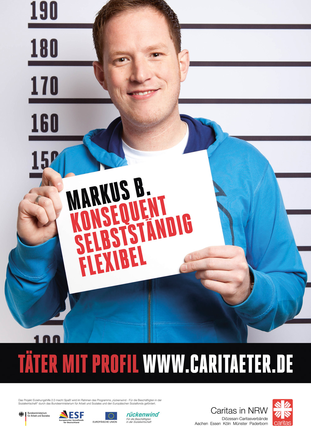 "CARITÄTER - Täter mit Profil" - Unter diesem provokanten Motto stellte die Caritas NRW die gleichnamige Kampagne zur Fachkräftegewinnung in der Erziehungshilfe vor. Tatort war das "Haus der Caritas" in der Essener City, Tatzeitpunkt: ein grauer Montag. An diesem Tag haben 26 "Caritäter" ihr "Fahndungsfoto" präsentiert.