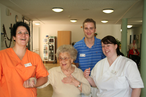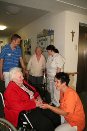 Auch für Ramea Bienert ist Altenpflege berufliches Wunschziel: "Ich wollte in die Pflege", betont sie. "Ein kleines Lächeln, ein Händedruck…, alte Menschen geben einem so viel zurück, wenn man sich mit ihnen befasst!" Ähnlich sieht es Diana Höche. Ursprünglich wollte sie als Erzieherin in der Kindertagestätte arbeiten. Doch in der Probephase merkte sie, das stimmte noch nicht so ganz. Sie suchte nach Alternativen. Bei einem Praktikum im Altenpflegeheim dann wusste sie: Das ist es! "Ich habe bei der Arbeit sehr viel Spaß", betont sie, und man will es ihr sofort glauben, begleitet man sie durch die Wohngruppe. An keinem der Bewohner geht sie wortlos vorbei, für eine kleine Geste, ein kurzes Sätzchen im Vorübergehen ist immer Zeit.