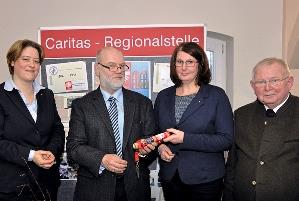 In seiner letzten Rede als Leiter der Caritas-Regionalstelle in Senftenberg sagte Clemens Wilkowski unter anderem: "Da Not immer persönlich erlebt wird, benötigen Rat- und Hilfesuchende persönliche auf Vertrauen beruhende Zuwendung. Caritas-Fürsorge und Caritas-Sozialarbeit ist Vertrauensarbeit." Damit dies auch weiterhin klappt, übergab er seiner Nachfolgerin, Bettina Schwarz, den Generalschlüssel und einen Caritas-Staffelstab.