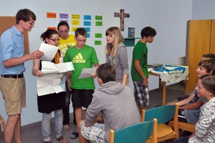 Fünf Wochen lag seine Priesterweihe zurück und schon musste sich Kaplan Krystian Gwizdala aus Berlin bewähren. 14 Kinder der Gruppe der Kleinen der Caritas-Kinderfreizeit diskutierten mit ihm munter über Jesus und seine Kirche. Und dabei waren sie um Antworten nicht verlegen: Auf die Frage, wie man Papst wird, wusste die achtjährige Antonia: "Man ist als erstes Kaplan, dann Pfarrer und so stuft sich das hoch". Ein anderes Kind ergänzte: "Man wird nicht aus Versehen Papst, das wird vererbt". Und Pfingsten? "Pfingsten begann die Kirche, weil es da ein verlängertes Wochenende gab", meinte Antonia.