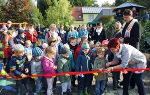 Ein Jahr nach der Einweihung des Erweiterungsbaues haben wir nun auch das Endziel erreicht - die Fertigstellung und Neugestaltung des Außenbereiches. Während des Herbstfestes, zu dem sich am 20. September pünktlich 16:00 Uhr viele kleine und große Leute in unserer Kita versammelten, segnete Pfarrer Roland Elsner den neuen Spielplatz. Kinder mit Zylinder und Blumenhütchen auf den Köpfen und zufriedene Mitarbeiterinnen sagten mit Tanz und Lied "Danke". Nach einem kleinen Programm der Kinder wurde unter Seifenblasenregen ein bunt geschmücktes Band durchschnitten und zum gemeinsamen Spielen und Feiern eingeladen. Sogar die Sonne zeigte sich in diesem Moment.