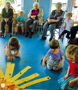 Gemeinsam mit den Senioren legten die Kinder als Schaubild eine Sonne und nannten ihre Wünsche dabei.Hiltrud Kirchner
