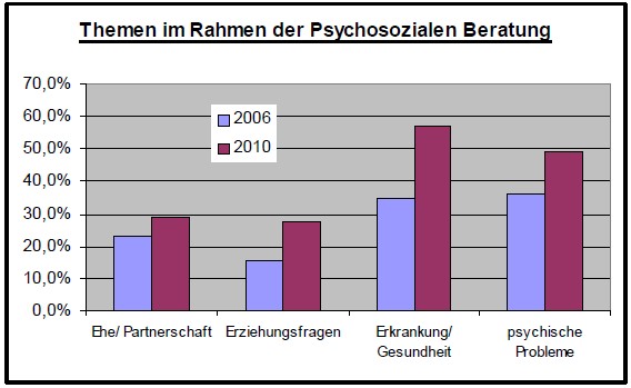 Fast 60% der Ratsuchenden hatten 2010 gesundheitliche Probleme (gegenüber etwa 35% in 2006) und fast 50% hatten psychische Probleme (gegenüber 36% in 2006). Zukunftsängste und psychische Belastungen spielen bei Menschen, die nur teilweise oder gar nicht am Erwerbsleben teilhaben, eine noch größere Rolle als bei vollzeitbeschäftigten Arbeitnehmern. Bei Arbeitslosen lagen die Beratungen zu psychischen Problemen noch über dem Durchschnittswert.