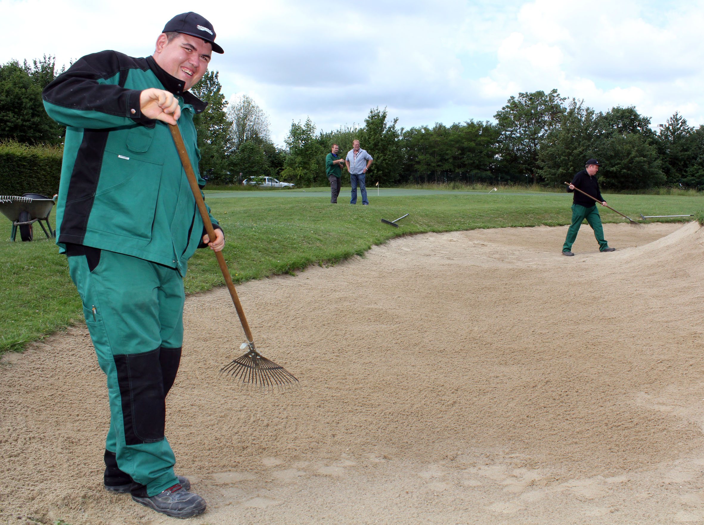 Das Mähen des Grüns ist eine der Lieblingsaufgaben der Greenkeeper. Bälle einsammeln, Unkraut stechen oder Brennnesseln absensen gehört aber auch mit dazu. "Morgens sieht es hier erst mal aus, als hätte es gehagelt", sagt Tewes. Auf der Driving Range, wo der Abschlag geübt wird, liegen überall weiße Golfbälle vom Vortag. Die müssen teils mit einer Maschine, teils von Hand eingesammelt und gewaschen werden. Dann geht es ans Papierkörbeleeren, anschließend stehen verschiedene Mäharbeiten an. Neben Grüns gibt es die Vorgrüns, "Fairways" und "Roughs", die auf unterschiedliche Längen gebracht werden müssen - von vier Millimetern auf den Grüns bis zum Wildwuchs an den Rändern. Die Sandbunker müssen geharkt und Unkraut gestochen werden, eine Arbeit, die Ulrich Pühse nicht so gern macht. "Da schon lieber Bälle sammeln oder Maschinen bewegen", sagt er. "Sonst würde ich nicht herkommen." Einen Führerschein hat er zwar nicht, er durfte aber an seinem vorherigen Arbeitsplatz in den Schlosswerkstätten Gabelstapler fahren. "Das vermisse ich", sagt er. "Dafür brauchte ich keinen Gruppenleiter, das konnte ich allein." Sein erklärtes Ziel: die größeren Maschinen auf dem Golfplatz fahren zu dürfen. Dafür legt sich der 35-Jährige mächtig ins Zeug, passt auf, wenn Willi Tewes und André Flore etwas erklären. "Ich kapiere es am schnellsten", sagt er selbstbewusst, gibt seinen Teamkollegen auch schon mal Tipps, was sie besser machen können.