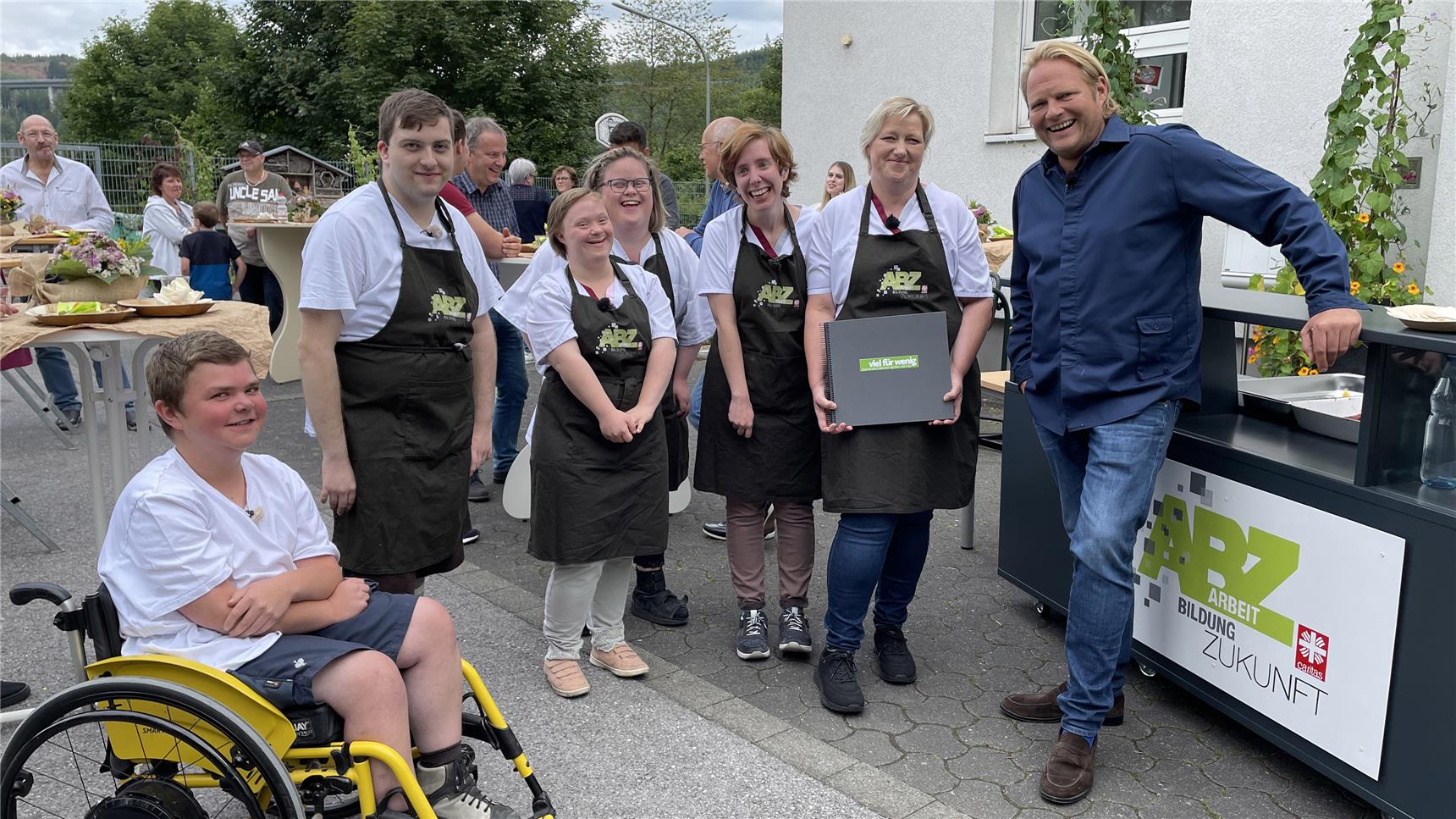 Ernst wurde es am nächsten Tag: Larissa, Katharina und die anderen sollten mit Björn Freitags Hilfe ein ganzes Catering auf die Beine stellen. Unter anderem standen Köttbullar-Spieße und Mangoldkuchen auf dem Speiseplan. Obwohl die Zeit knapp wurde und das Küchenteam nervös war, gelang das professionelle Catering. Den Gästen, Mitarbeitern aus der Nachbarschaft, die Björn Freitag eingeladen hatte, schmeckte es sichtlich. "Es war schön zu sehen, mit wie viel Freude und Konzentration unsere Beschäftigten dabei waren", freut sich Steffi Bierwagen, Einrichtungsleiterin des Arbeits- und Bildungszentrums der Caritas Arnsberg-Sundern. "Und auch für sie selber war es eine super Erfahrung zu sehen, dass sie solch eine große Herausforderung stemmen können."