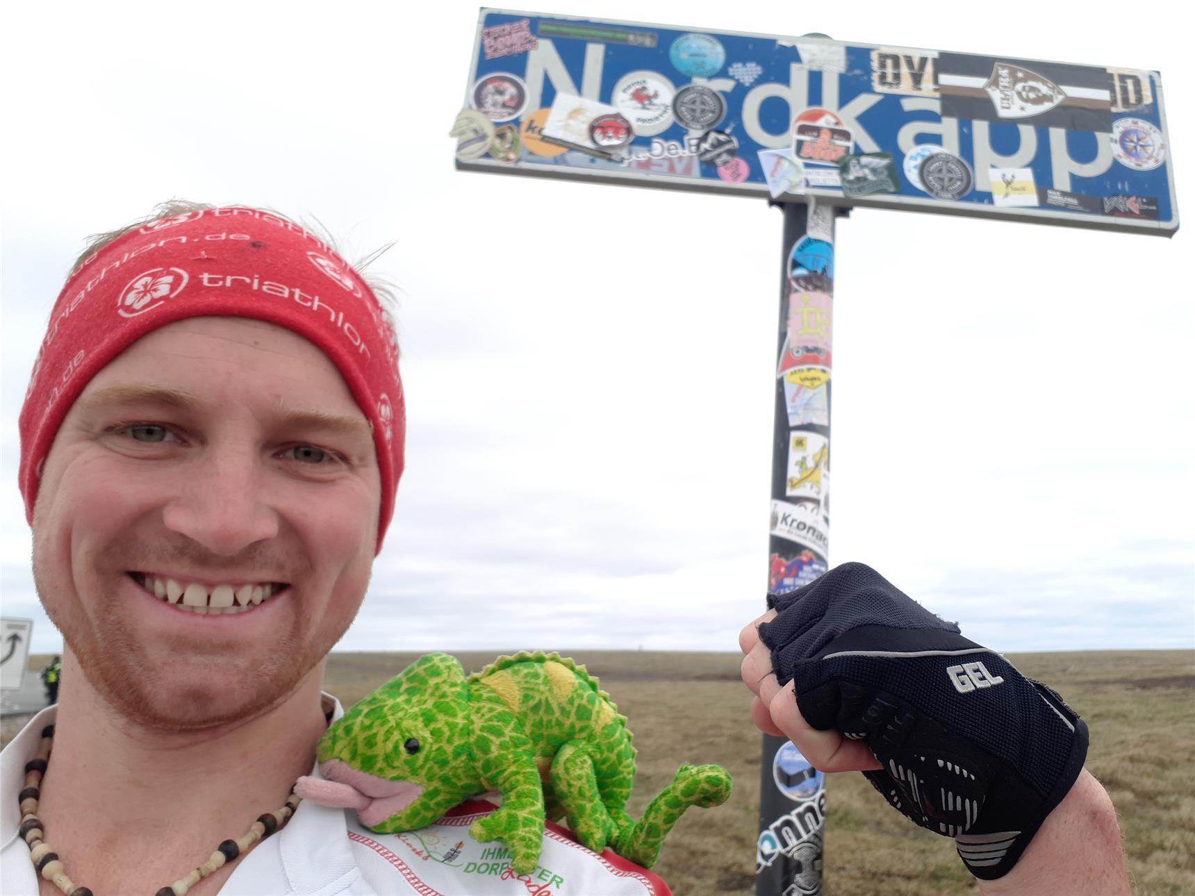 Als Dennis Breiser auf seinem Rad nach tagelangem Kampf gegen Wind und Regen das Nordkap erreichte, da überwältigten ihn die Gefühle. "Das war das krasseste Erlebnis", berichtet er begeistert ein halbes Jahr nach dem Start seiner Radtour durch Europa. 3500 Kilometer lagen am Nordkap hinter dem 26-Jährigen, eine Radtour mit seinem rund 40 Kilogramm schweren Rad durch Polen, das Baltikum, Finnland, Schweden und Norwegen. Klar, dass er seine Ankunft am Nordkap mit einigen Selfies festhielt. Bei der beschwerlichen Fahrt immer auf der Lenkertasche mit dabei: das Stoff-Chamäleon Leo. Es erinnert ihn beständig an die Chamäleon-Gruppen des Caritasverbandes Iserlohn, Hemer, Menden, Balve e. V. "Ich möchte die Aufmerksamkeit auf diese Gruppen lenken", erzählt er. "Denn in den Gruppen wird Kindern aus sucht- und seelisch belasteten Familien geholfen."