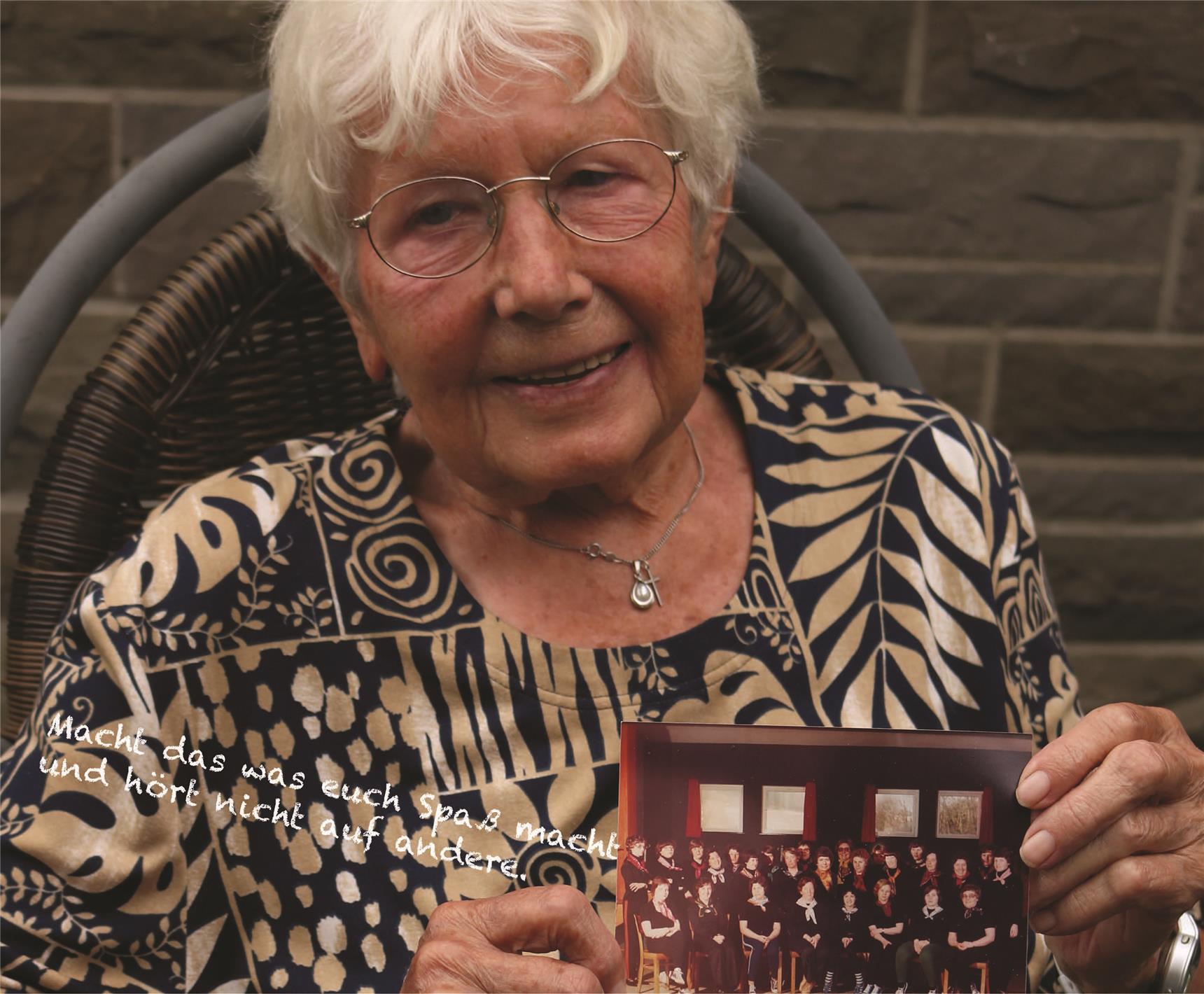 Der Ratschlag von Josefa Droste wird spätestens im September 2021 in zahlreichen Familien im Schmallenberger Ortsteil Oberkirchen gelesen und diskutiert werden. Denn ein Porträt der 92-Jährigen, bei dem sie ein Foto der Gründungsgesellschaft "ihres" Turnvereins in der Hand hält, ziert das September-Blatt eines eigens für Oberkirchen produzierten Kalenders. Die 14-jährige Mia Schütte hat das Foto bei dem Gesprächstermin gemacht.
