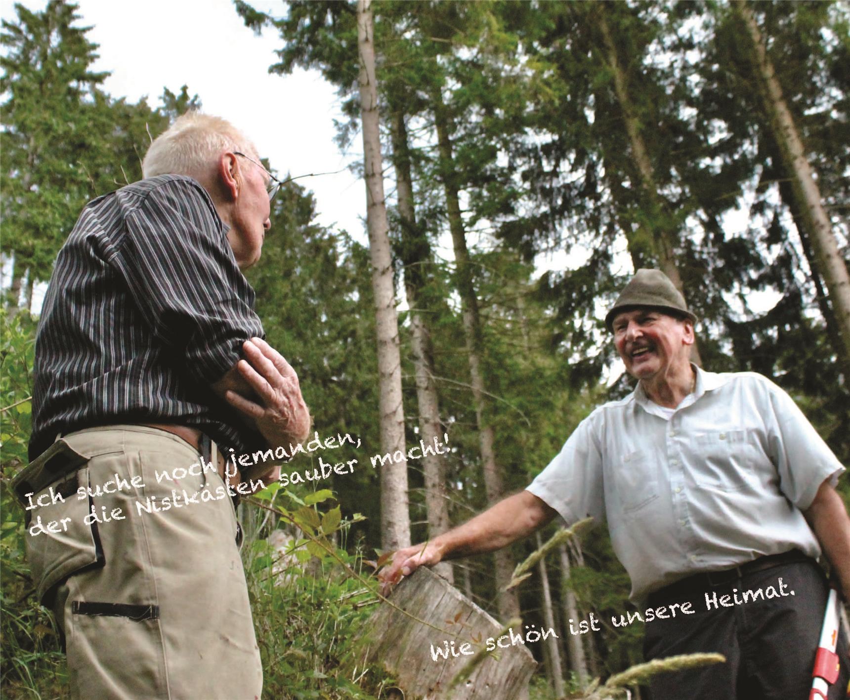 Und dann ging es ans Fotografieren. In zwei Teams besuchten die Mädchen diejenigen, die sich für das Gemeinwohl einsetzen: Frauen, die Ferienfreizeiten planen oder sich um Kirche, Kapelle und Messdiener kümmern; Männer, die den Friedhof und die Schützenhalle in Schuss halten, Nistkästen säubern oder Waldwege wieder Instand setzen. Etwa Meinolf Mergheim, den man auf Spaziergängen rund um Oberkirchen im Wald treffen kann, wie er Bänke repariert und alte Wege wieder freilegt. Was der 82-Jährige über den Wald und seine Flora und Fauna zu erzählen weiß, fasziniert die Zehn- bis Zwölfjährigen. Jennifer Verzellesi (10) gelingt dabei ein Foto für das Mai-Kalenderblatt, das den geselligen Meinolf Mergheim inmitten seines geliebten Waldes zeigt, im Gespräch mit Johannes Hütten, der seit Jahren in und um Oberkirchen die Nistkästen säubert und nun einen Nachfolger sucht.